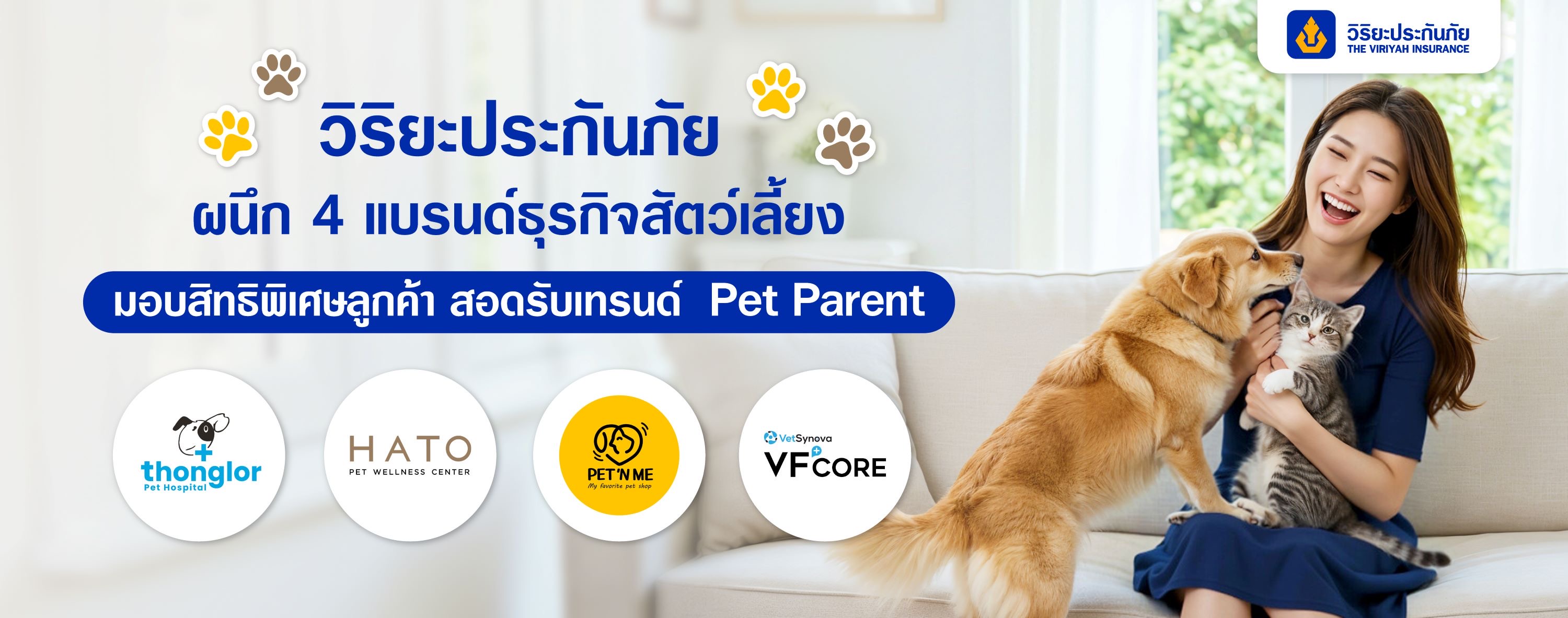 เพื่อตอกย้ำถึงการใส่ใจดูแลลูกค้าในทุกมิติ ในช่วง 2-3 ปีที่ผ่านมา เทรนด์ Pet Parent ‘เลี้ยงสัตว์เหมือนลูก’ยังคงเป็นกระแสที่ได้รับความนิยมอย่างต่อเนื่องมาจนถึงปัจจุบัน วิริยะประกันภัยเข้าใจถึงความรักและห่วงใยที่ลูกค้ามีต่อสัตว์เลี้ยง จึงได้ผนึกกำลังกับ 4 พันธมิตรธุรกิจสัตว์เลี้ยงแนวหน้าของประเทศ ส่งมอบสิทธิพิเศษสำหรับสัตว์เลี้ยง เฉพาะลูกค้าวิริยะประกันภัยเท่านั้น