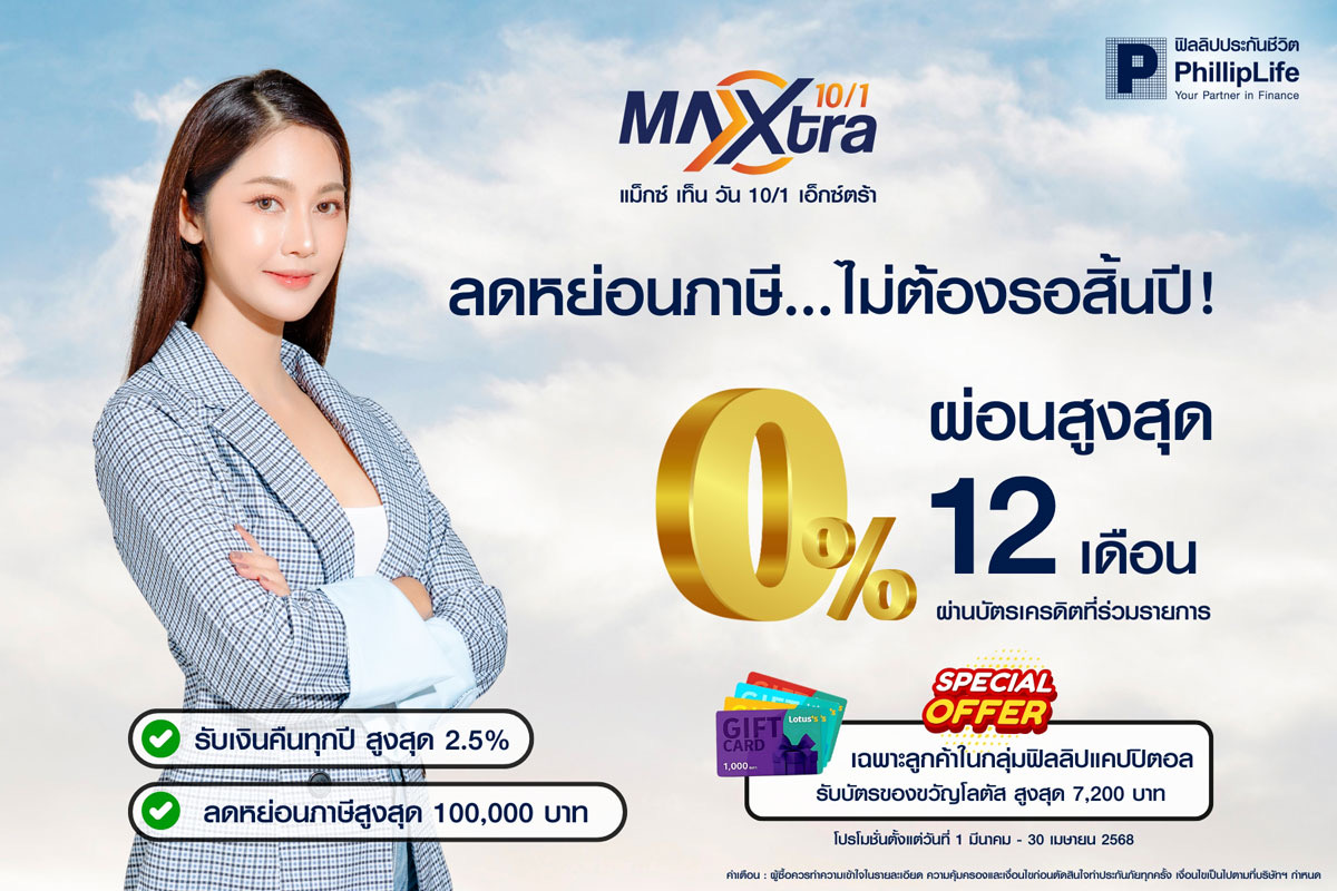 นายธฤทธิ์ พรหมนารถ กรรมการผู้จัดการ บริษัท ฟิลลิปประกันชีวิต จำกัด (มหาชน) กล่าวว่าในช่วงปลายปีถึงต้นปี หลายคนได้รับโบนัสเป็นของขวัญจากความมุ่งมั่นทำงานมาตลอดทั้งปี นี่จึงเป็นช่วงเวลาที่เหมาะสมสำหรับการวางแผนการเงิน ประกันชีวิตคือหนึ่งในทางเลือกที่จะช่วยให้คุณออมเงินอย่างมีวินัย พร้อมได้รับสิทธิประโยชน์ทางภาษี โดยบริษัทฯ มีนโยบายที่จะพัฒนาผลิตภัณฑ์เพื่อตอบโจทย์ความต้องการของลูกค้าให้อย่างตรงจุดและพัฒนาบริการให้ตรงกับไลฟ์สไตล์ของผู้คนที่เปลี่ยนแปลงไป เพื่อเป็นทางเลือกให้ลูกค้าและเพิ่มโอกาสในการบริหารเงินได้อย่างมีประสิทธิภาพ จึงได้จัดโปรโมชั่นให้ลูกค้าที่ซื้อผลิตภัณฑ์ออนไลน์ “แม็กซ์ เท็น วัน เอ็กซ์ตร้า 10/1 (Max Ten One Xtra 10/1)” กับบริษัทฯ สามารถชำระค่าเบี้ยประกันภัยผ่านบัตรเครดิตได้ หรือเลือกผ่อนชำระค่าเบี้ยประกันภัยรายปี 0% ได้นานสูงสุดถึง 12 เดือน (เฉพาะบัตรเครดิตที่ร่วมรายการ) และพิเศษ! สำหรับลูกค้าในกลุ่มฟิลลิปแคปปิตอล รับข้อเสนอสุดคุ้มก่อนใคร