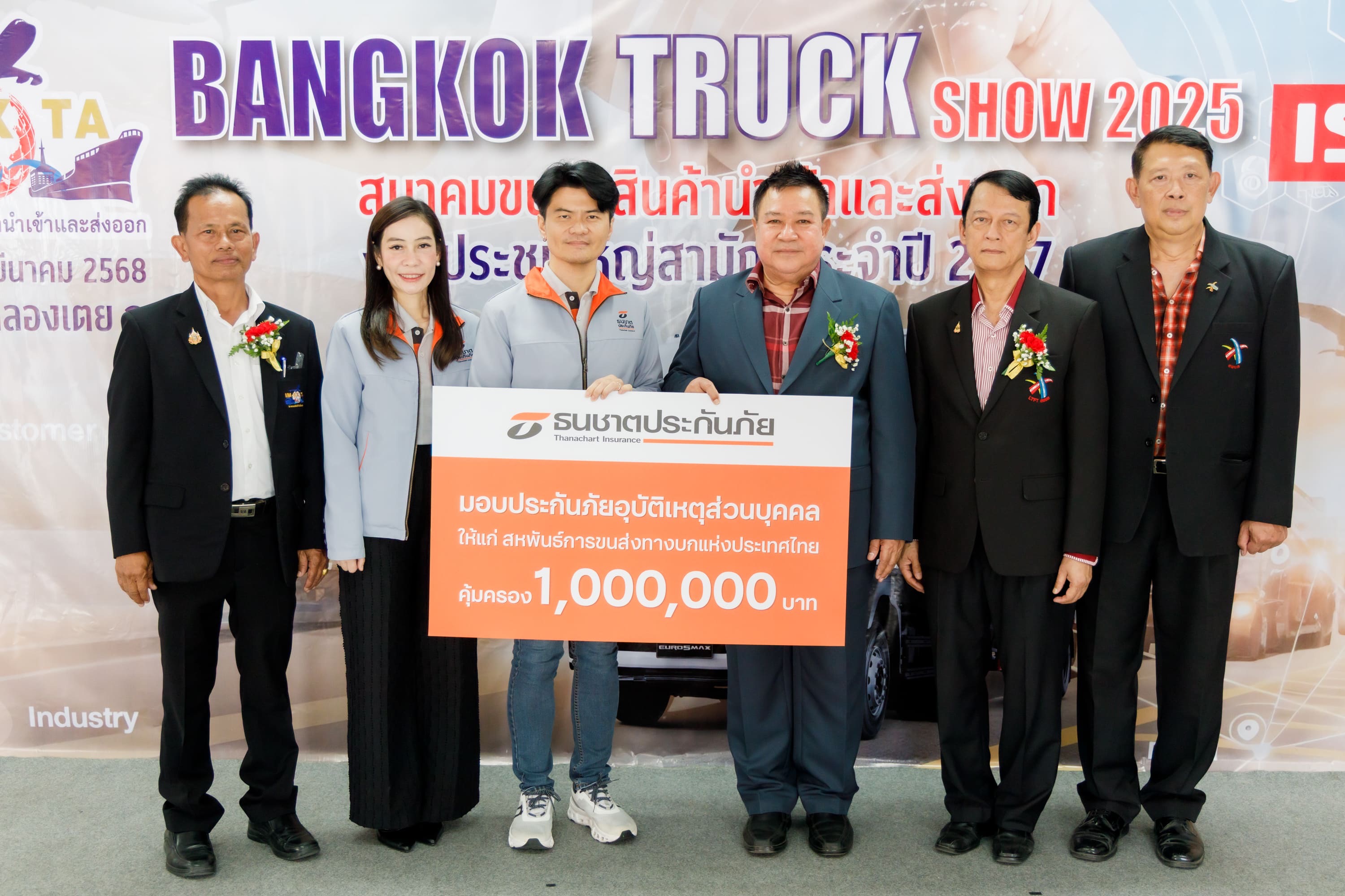 บริษัท ธนชาตประกันภัย จำกัด (มหาชน) โดย นายอาทิตย์ แชประเสริฐ Head - Corporate Finance and Dealer Marketing ร่วมมอบกระเช้าแสดงความยินดี และมอบกรมธรรม์ประกันอุบัติเหตุส่วนบุคคล ทุนประกันภัย 1,000,000 บาท ให้กับ ดร.ทองอยู่ คงขันธ์ ประธานสหพันธ์การขนส่งทางบกแห่งประเทศไทย และตัวแทนนายกสมาคมขนส่งสินค้านำเข้าและส่งออก (Import- Export Transport Association หรือ IM-EX TA) ในโอกาสการจัดประชุมใหญ่สามัญประจำปี 2567 และความสำเร็จของจัดงาน Bangkok Truck Show 2025 ณ PAT ARENA การท่าเรือแห่งประเทศไทย ซึ่งธนชาตประกันภัย ได้ร่วมออกบูธภายในงานนี้ด้วย เพื่อประชาสัมพันธ์ผลิตภัณฑ์ประกันภัยรถบรรทุก พร้อมนำเสนอบริการและความคุ้มครองที่ได้คุณภาพและมาตรฐานสอดคล้องกับความต้องการของผู้ประกอบการภาคธุรกิจการขนส่งด้วยรถบรรทุกของไทย