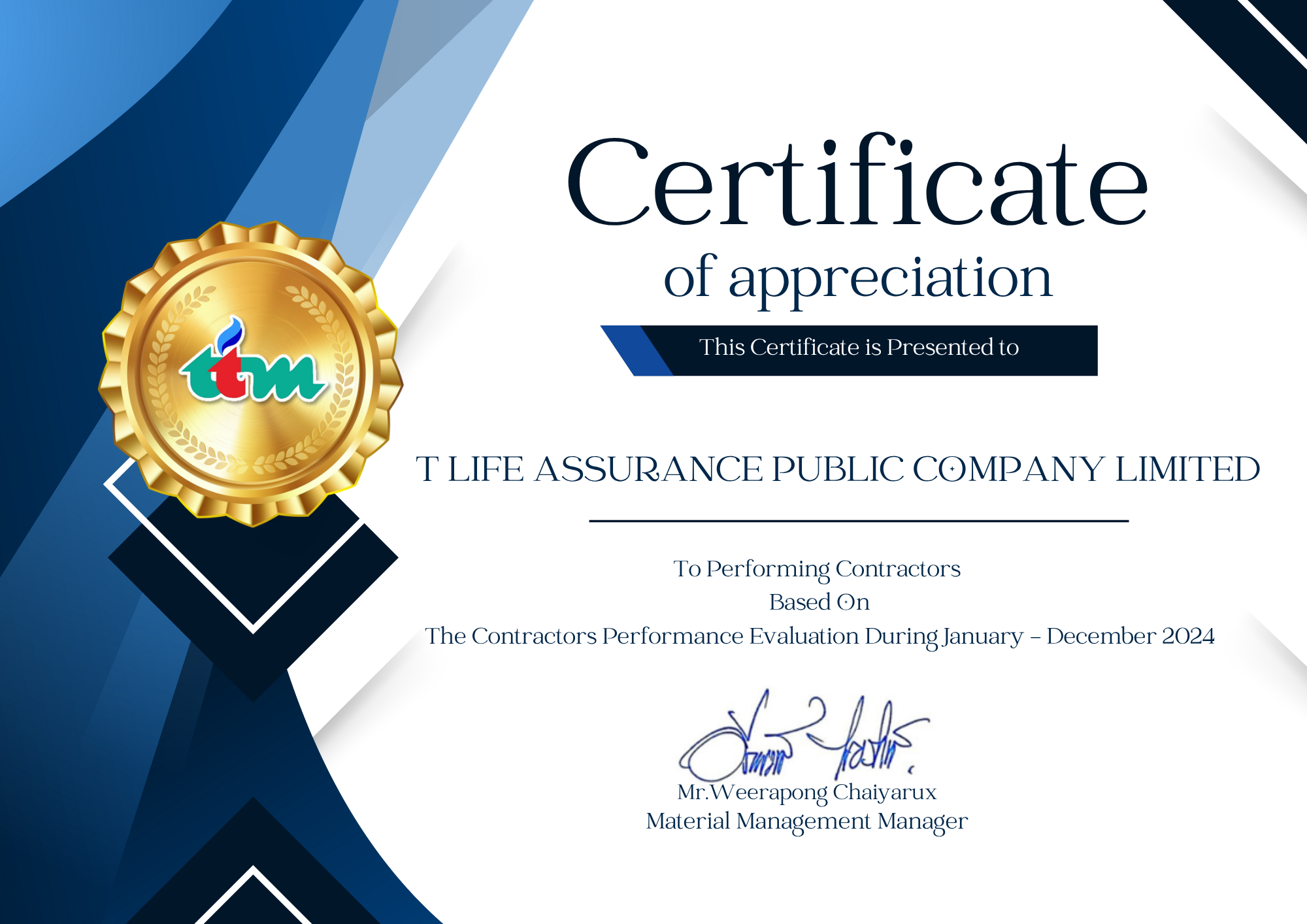 นายวุฒิเลิศ สุวรรณศรี กรรมการผู้จัดการ บริษัท ที ไลฟ์ ประกันชีวิต จำกัด (มหาชน) กล่าวว่า “ตลอดปีที่ผ่านมา ที ไลฟ์ ประกันชีวิต ได้ให้บริการประกันชีวิตกลุ่ม (Group Insurance) แก่ ทีทีเอ็ม โดยมอบความคุ้มครองกรณีเสียชีวิตสำหรับพนักงาน ซึ่งการได้รับประกาศนียบัตรในครั้งนี้ สะท้อนถึงความมุ่งมั่นในการดำเนินงานด้วยความเป็นมืออาชีพและมีประสิทธิภาพอย่างต่อเนื่อง”