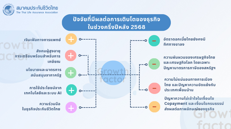 แต่ในขณะเดียวกันธุรกิจประกันชีวิตยังคงต้องติดตามแนวโน้มและความผันผวนของสถานการณ์เศรษฐกิจทั้งในประเทศและต่างประเทศอย่างใกล้ชิด โดยเฉพาะในประเด็นสำคัญอย่าง อัตราดอกเบี้ย และ ภาวะเงินเฟ้อซึ่งส่งผลกระทบโดยตรงต่อพฤติกรรมการออม การลงทุน รวมถึงภาระหนี้สินของภาคครัวเรือน ที่มีผลต่อความสามารถการใช้จ่ายและการวางแผนทางการเงินของประชาชน นอกจากนี้ ยังต้องจับตาสถานการณ์ภูมิรัฐศาสตร์โลกที่ยังคงมีความตึงเครียดในหลายภูมิภาค รวมทั้งปัญหาชายแดนประเทศไทย และการดำเนินมาตรการทางภาษีของสหรัฐฯ นำไปสู่ภาวะสงครามการค้า สิ่งเหล่านี้ล้วนส่งผลกระทบต่อราคาพลังงาน ระดับเงินเฟ้อ จนทำให้เศรษฐกิจโลกชะลอตัว