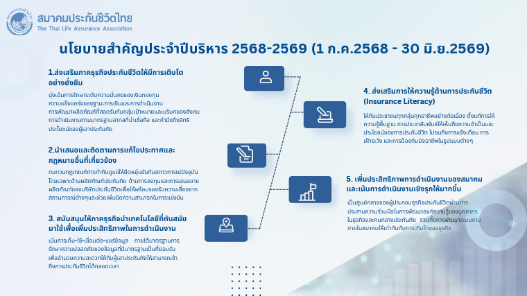 ดังนั้น เพื่อให้ธุรกิจประกันชีวิตสามารถเติบโตอย่างมั่นคงในระยะยาว ท่ามกลางสภาพแวดล้อมที่เปลี่ยนแปลงอย่างรวดเร็ว สมาคมประกันชีวิตไทยจึงเดินหน้าผนวกแนวคิด ESG (Environment, Social, Governance) เข้ากับกระบวนการดำเนินงานอย่างเป็นระบบ ทั้งในด้านการพิจารณาการลงทุน การออกแบบผลิตภัณฑ์ และการพัฒนาบริการที่ตอบโจทย์ความต้องการของประชาชนในยุคปัจจุบัน การดำเนินงานดังกล่าวครอบคลุมตั้งแต่การส่งเสริมความรับผิดชอบต่อสิ่งแวดล้อม การคำนึงถึงบทบาทของธุรกิจต่อสังคม ตลอดจนการยึดมั่นในหลักธรรมาภิบาลและความโปร่งใสในการกำกับดูแลกิจการ เพื่อให้ภาคธุรกิจประกันชีวิตไม่เพียงแต่สามารถปรับตัวรับมือความท้าทายต่าง ๆ ได้อย่างมีประสิทธิภาพ แต่ยังสร้างคุณค่าให้กับสังคมในวงกว้างเพื่อขับเคลื่อนสู่อนาคตที่ยั่งยืนร่วมกัน