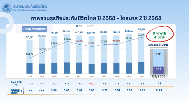 นางนุสรา (อัสสกุล) บัญญัติปิยพจน์ นายกสมาคมประกันชีวิตไทย เผยภาพรวมธุรกิจประกันชีวิตในช่วงครึ่งแรกปี 2568 ระหว่าง มกราคม – มิถุนายน มีเบี้ยประกันภัยรับรวม (Total Premium) อยู่ที่ 326,588 ล้านบาท เติบโตเพิ่มขึ้นร้อยละ 4.87 เมื่อเทียบกับระยะเวลาเดียวกันของปี 2567 จำแนกเป็น