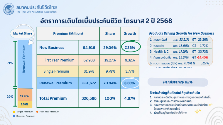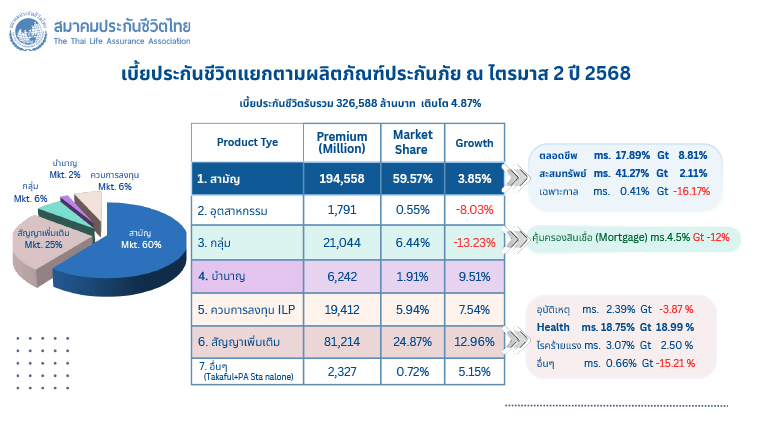 สำหรับผลิตภัณฑ์ประกันชีวิตที่ได้รับความนิยมและมีอัตราการเติบโตมากขึ้นในช่วงครึ่งแรก ปี 68 คือ สัญญาเพิ่มเติมประกันสุขภาพ ที่มีเบี้ยประกันภัยรับรวมอยู่ที่ 61,219.52 ล้านบาท เติบโตเพิ่มขึ้นร้อยละ 18.99 คิดเป็นสัดส่วนร้อยละ 18.75 ซึ่งหลัก ๆ มาจากการที่ประชาชนใส่ใจดูแลสุขภาพและเริ่มตระหนักถึงความสำคัญในการทำประกันสุขภาพมากขึ้น เพื่อบริหารความเสี่ยงและรับมือกับค่ารักษาพยาบาลที่มีแนวโน้มเพิ่มสูงขึ้น (Medical Inflation) ในขณะที่ ผลิตภัณฑ์ประกันชีวิตแบบบำนาญ (Pension) ก็ได้รับความสนใจจากประชาชนเป็นอย่างมาก ส่งผลให้มีเบี้ยประกันภัยรับรวมอยู่ที่ 6,241.62 ล้านบาท เติบโตเพิ่มขึ้นร้อยละ 9.51 หรือ คิดเป็นสัดส่วนร้อยละ 1.91 นอกจากนั้น ผลิตภัณฑ์ประกันชีวิตควบการลงทุน (Investment Link) ก็มีเบี้ยประกันภัยรับรวมถึง 19,412.36 ล้านบาท เติบโตเพิ่มขึ้นร้อยละ 7.54 หรือ คิดเป็นสัดส่วนร้อยละ 5.94 เนื่องจากนักลงทุนมองหาช่องทางการลงทุนใหม่ ที่มีโอกาสได้รับผลตอบแทนจากการลงทุนที่สูงขึ้นภายใต้ระดับความเสี่ยงที่พอรับได้ รวมถึงได้รับความคุ้มครองจากการประกันชีวิตรวมอยู่ด้วย