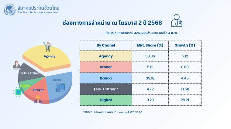 6. การขายผ่านช่องทางอื่น (Others) เช่น การขาย Worksite , Walkin การขายผ่านการออกบูธ การขายผ่านร้านค้าสะดวกซื้อ เป็นต้น เบี้ยประกันภัยรับรวมอยู่ที่ 9,000 ล้านบาท อัตราการเติบโตเพิ่มขึ้นร้อยละ 17.69 เมื่อเทียบกับปี 2567 คิดเป็นสัดส่วนร้อยละ 2.76