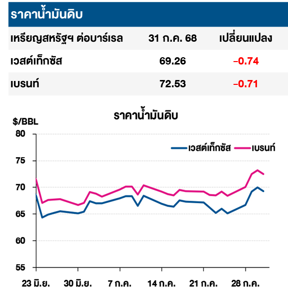 (-) ราคาน้ำมันดิบปรับลดลง หลังตลาดจับตาผลกระทบจากมาตรการภาษีนำเข้าของสหรัฐฯ ที่ประกาศโดยทรัมป์ ซึ่งจะมีผลบังคับใช้ในวันที่ 1 ส.ค. 68 แม้หลายประเทศจะบรรลุข้อตกลงแล้ว แต่อีกหลายประเทศยังอยู่ระหว่างการเจรจา ตลาดคาดว่าการขึ้นภาษีดังกล่าวจะส่งผลกระทบต่อความต้องการใช้น้ำมัน