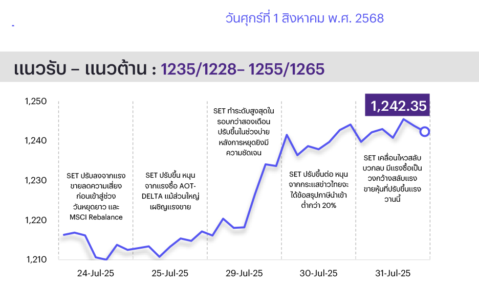 คาดตลาดแกว่งตัวผันผวน/พักตัว ไทยได้อัตราภาษีอัตรา 19% เป็นระดับที่เท่ากับประเทศอื่นในภูมิภาค อย่าง อินโดนีเซีย ฟิลิปปินส์ และมาเลเซีย และต่ำกว่าเวียดนามที่ 20% ทำให้ในระยะกลางไทยยังคงศักยภาพในการแข่งขัน แต่ระยะสั้นตลาดปรับตัวขึ้นสะท้อนความคาดหวังไปในระดับหนึ่งแล้ว หากพักแค่ช่วงสั้นต้องไม่หลุดต่ำกว่า 1228 แนวรับ 1235/1228 ส่วนแนวต้านประเมินไว้ที่ 1255/1265 คาดว่ายังไม่ผ่าน