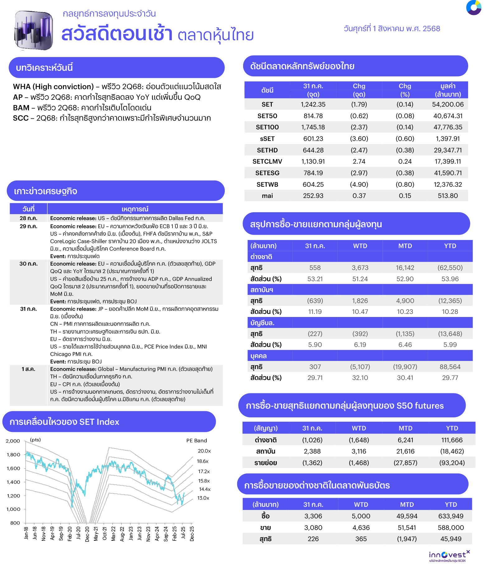 3. Trading Idea: สำหรับนักลงทุนที่รับความเสี่ยงได้สูงและต้องการเก็งกำไร แนะนำ 1) หุ้น Laggard Play ซึ่งคาดได้อานิสงส์หาก Fund Flow ไหลเข้าต่อเนื่อง โดยเลือกหุ้น SET50 ซึ่งราคาหุ้นปรับขึ้น MTD ต่ำกว่า SET และ Valuation ถูก (PBV และ PER 2568F < -1SD) และพื้นฐานดี แนะนำ BDMS CPALL MINT MTC PTT 2) หุ้นที่คาดฟื้นตัวเร็วและเชื่อว่าการเจรจาจะทำให้สหรัฐฯ พิจารณาปรับลดภาษีไทยลงมาที่ระดับ 20% หรือต่ำกว่า จะช่วยฟื้นฟูความเชื่อมั่นและทำให้ FDI กลับเข้าสู่ไทย แนะนำ AMATA GPSC WHA และ 3) หุ้นที่คาดฟื้นตัวเร็วและเชื่อว่าความขัดแย้งไทย-กัมพูชาจะคลี่คลายลงหรือยุติได้เร็ว แนะนำ AEONTS CBG