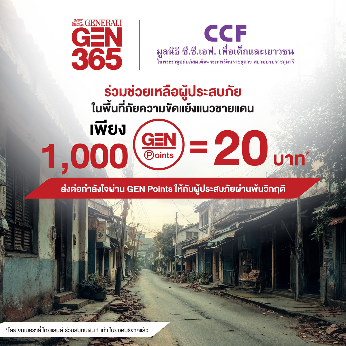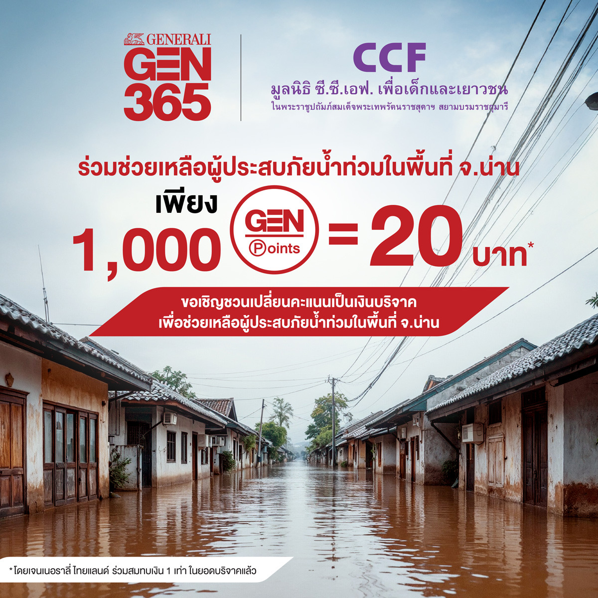 เจนเนอราลี่ ไทยแลนด์ ผนึกกำลัง มูลนิธิ ซี.ซี.เอฟ เพื่อเด็กและเยาวชน เดินหน้าช่วยเหลือผู้ประสบภัยน้ำท่วมในพื้นที่จังหวัดน่าน และผู้ได้รับผลกระทบจากสถานการณ์ความขัดแย้งในพื้นที่แนวชายแดน ชวนลูกค้าเจนเนอราลี่ ไทยแลนด์ มาร่วมเป็นส่วนหนึ่งในการส่งต่อความห่วงใยด้วยการเปลี่ยนคะแนนสะสม GEN Points ผ่านแอปพลิเคชัน GEN 365 เป็นเงินบริจาค
