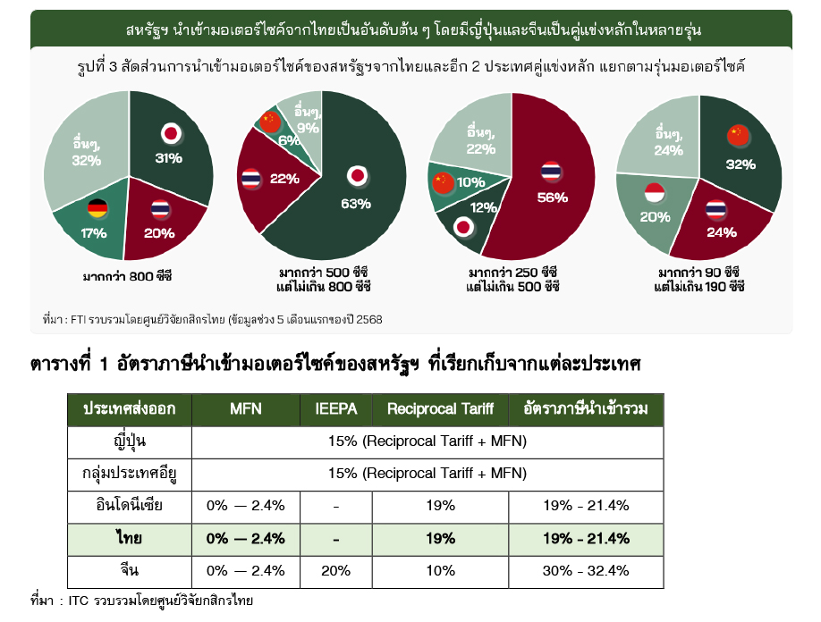 · ภาษีศุลกากรตอบแทน (Reciprocal Tariff) 19% ที่ไทยได้รับ คาดกระทบต่อการส่งออกมอเตอร์ไซค์ไปสหรัฐฯ เป็นบางรุ่น โดยรุ่นที่อาจเผชิญการแข่งขันมากขึ้น คือ รุ่นขนาดมากกว่า 800 ซีซี และรุ่นขนาดมากกว่า 90 ซีซี แต่ไม่เกิน 190 ซีซี