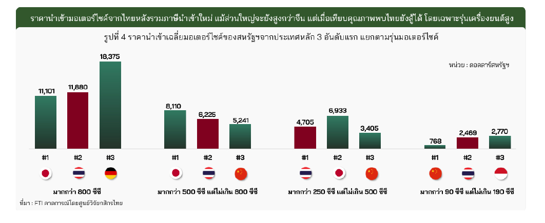 - รุ่นขนาดมากกว่า 800 ซีซี พบราคานำเข้าจากไทยขยับสูงขึ้นกว่าญี่ปุ่นคู่แข่งสำคัญ แม้ที่ผ่านมาจะเคยต่ำกว่า ทำให้มอเตอร์ไซค์ที่สหรัฐฯ นำเข้าจากไทยรุ่นนี้ ซึ่งส่วนใหญ่เป็นยี่ห้อตะวันตก อาจต้องเจอการแข่งขันมากขึ้นจากมอเตอร์ไซค์นำเข้าจากญี่ปุ่น