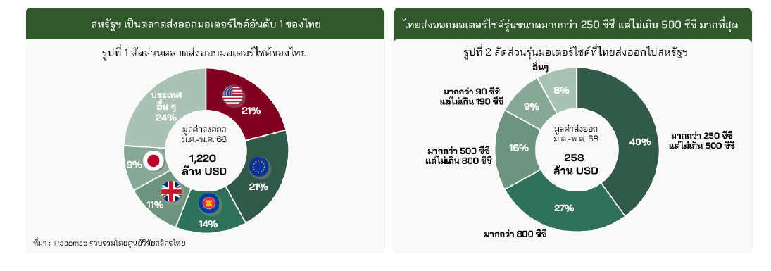 ปัจจุบัน ไทยอยู่ในสถานะประเทศส่งออกมอเตอร์ไซค์อันดับ 5 ของโลก (ตามมูลค่าส่งออก) ซึ่งปี 2567 ที่ผ่านมาสามารถส่งออกไปถึง 99 ประเทศทั่วโลก โดยมีสหรัฐฯเป็นประเทศที่ไทยส่งออกไปเป็นอันดับ 1 ด้วยมูลค่าส่งออกรวมช่วง 5 เดือนแรกของ ปี 2568 ที่ประมาณ 258 ล้านดอลลาร์ฯ หรือคิดเป็นสัดส่วนประมาณ 21% ของมูลค่าการส่งออกมอเตอร์ไซค์รวมของไทยที่ 1,220 ล้านดอลลาร์ฯ (รูปที่ 1) โดยรุ่นมอเตอร์ไซค์ที่ไทยส่งออกไปสหรัฐฯ มากที่สุด คือ มอเตอร์ไซค์รุ่นขนาดมากกว่า 250 ซีซี แต่ไม่เกิน 500 ซีซี (รูปที่ 2)