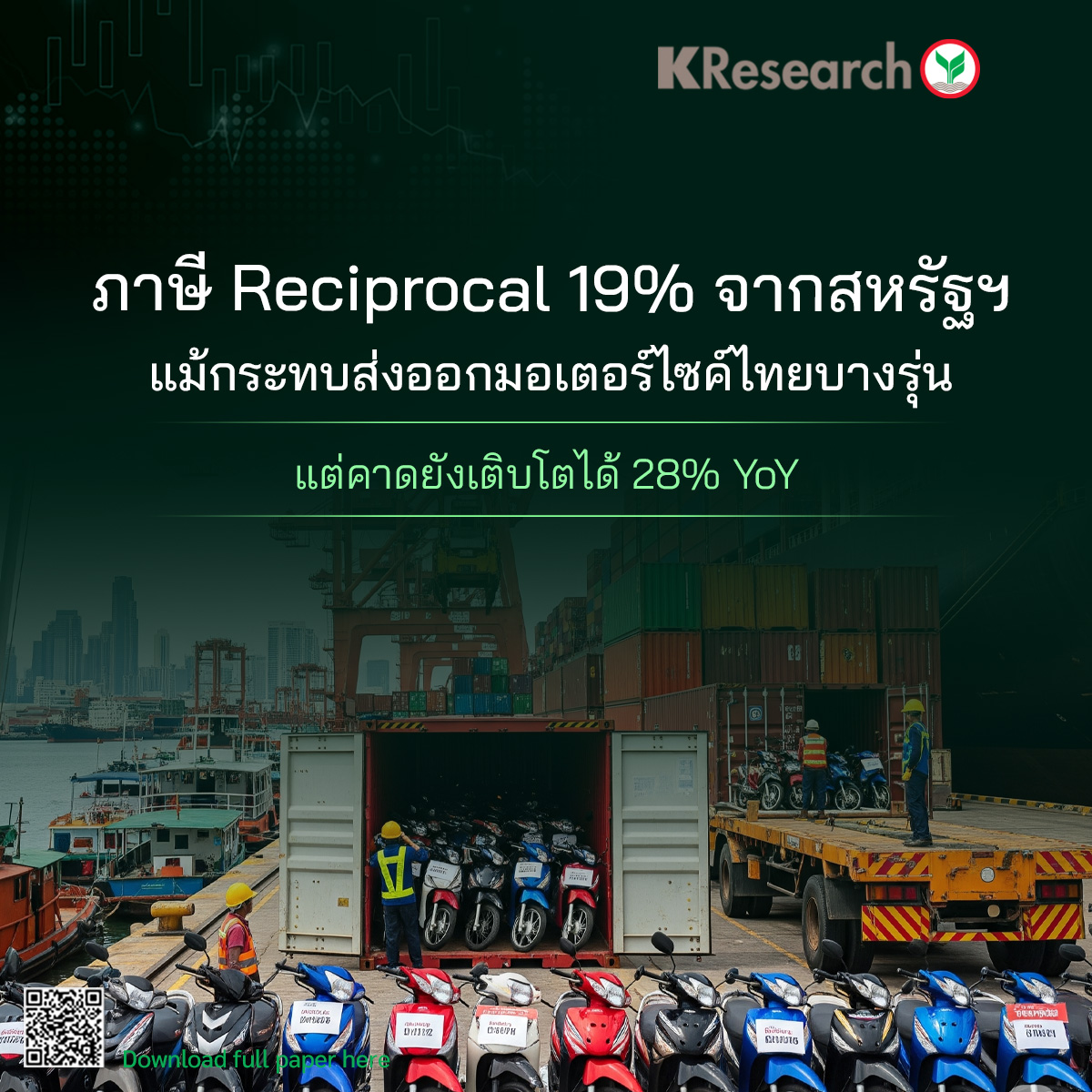 · ทว่า มอเตอร์ไซค์ส่งออกจากไทยราว 56% ไปสหรัฐฯ ยังแข่งขันด้านราคาได้แม้โดนเรียกเก็บภาษีนำเข้าเพิ่มขึ้น ส่งผลให้มูลค่าการส่งออกมอเตอร์ไซค์ปี 2568 คาดว่าจะยังคงขยายตัว 28% (YoY) แม้มีประเด็นภาษีนำเข้าที่เพิ่มขึ้น