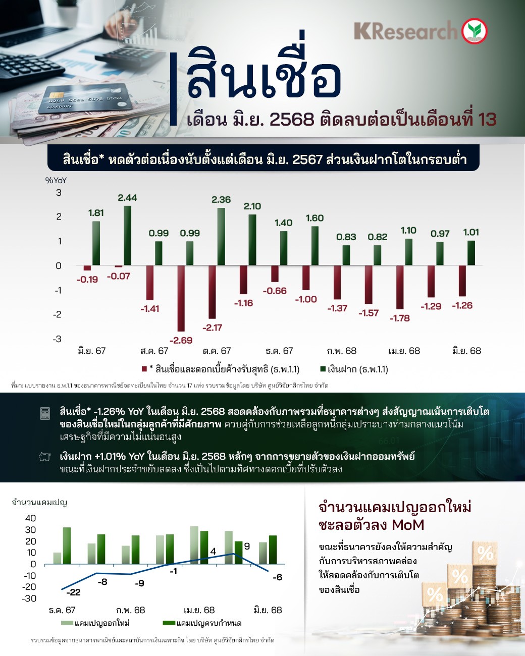 เงินให้สินเชื่อและดอกเบี้ยค้างรับสุทธิอยู่ที่ 13.68 ล้านล้านบาท ณ สิ้นเดือน มิ.ย. 2568 ลดลง 1.26% YoY เนื่องจากยังคงเผชิญแรงกดดันจากการชำระคืนหนี้ของลูกหนี้ ประกอบกับธนาคารยังคงพิจารณาปล่อยสินเชื่อใหม่อย่างระมัดระวัง สอดคล้องกับภาพรวมที่ธนาคารต่าง ๆ ส่งสัญญาณเน้นการเติบโตของสินเชื่อใหม่ในกลุ่มลูกค้าที่มีศักยภาพ ควบคู่กับการช่วยเหลือลูกหนี้เดิมที่อยู่ในกลุ่มเปราะบาง