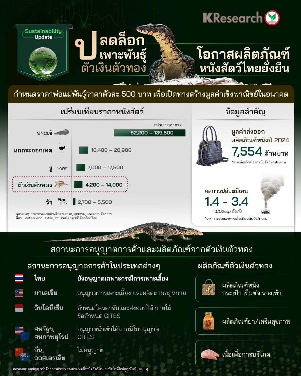 นอกจากนี้ ตัวเงินตัวทอง ยังเป็นสัตว์ที่ไม่มีการปล่อยมีเทนจากการย่อยอาหาร แตกต่างจากวัว/ควาย ซึ่งช่วยลดการปล่อยก๊าซเรือนกระจกได้สูงถึง 1.4 – 3.4 ล้านตันต่อตัวต่อปี ซึ่งอาจจะมีส่วนช่วยให้ผลิตภัณฑ์หนังจากตัวเงินตัวทองในอนาคตมีคาร์บอนฟุตพริ้นท์ต่ำลงกว่าผลิตภัณฑ์หนังประเภทอื่นๆ