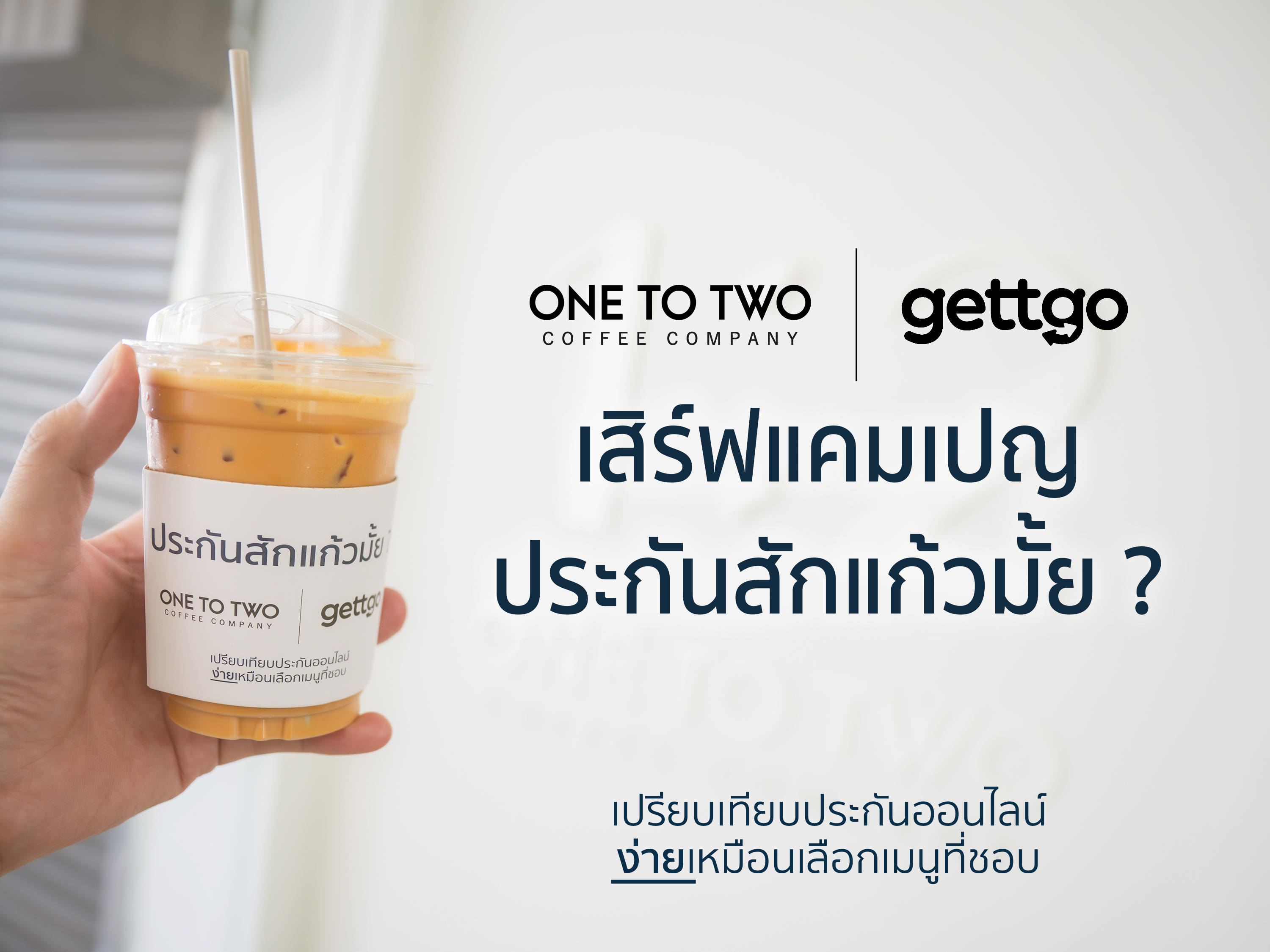 บริษัท เมืองไทย โบรกเกอร์ จำกัด ผู้ให้บริการ gettgo แพลตฟอร์มเปรียบเทียบประกันออนไลน์ ร่วมกับ 1:2 Coffee Company ร้านกาแฟขวัญใจชาวออฟฟิศ ที่เริ่มต้นจากจังหวัดเชียงรายและเติบโตสู่เมืองกรุง พร้อมชวนคนทุก Generation มาดื่มกาแฟชิล ๆ รับสิทธิ์ส่วนลดผ่านแคมเปญ “ประกันสักแก้วมั้ย?” และทำความรู้จักกับประกันในบรรยากาศสบาย ๆ ผ่านประสบการณ์การดื่มกาแฟที่ร้าน 1:2 Coffee