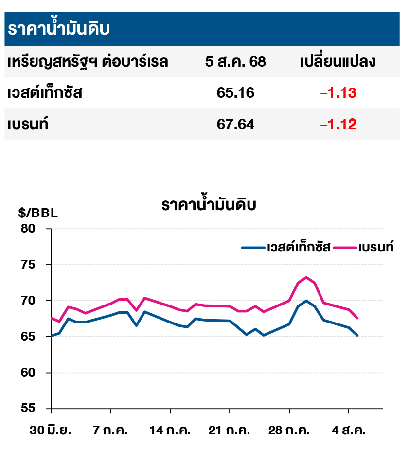 (-) ราคาน้ำมันดิบเวสต์เท็กซัส และ เบรนท์ปรับตัวลดลงต่อ หลังสหรัฐฯ เผยตัวเลขกิจกรรมภาคบริการ เดือน ก.ค. 68 ชะลอตัวลงอย่างชัดเจน โดยดัชนี PMI ภาคบริการปรับตัวลดลงเหลือเพียง 50.1 ซึ่งต่ำกว่าที่ตลาดคาดการณ์ไว้ และใกล้แตะระดับที่บ่งชี้ถึงการหดตัวของเศรษฐกิจ ท่ามกลางความกังวลต่ออุปทานน้ำมันดิบของกลุ่ม OPEC+ ที่มีมติปรับเพิ่มกำลังการผลิตในเดือนหน้า