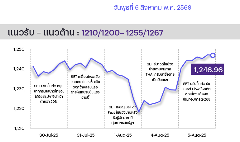 ช่วงสั้นมอง SET มีโอกาส Sideway หลังไทยได้ข้อสรุปการเจรจาทางการค้ากับสหรัฐฯ แม้ระยะสั้นอาจมีแรงขาย Sell on Fact จากการฟื้นตัวของ SET ขึ้นมาที่ระดับ 1230-1250 (PER ราว 14 เท่า) สะท้อนถึงความหวังว่าสหรัฐฯ จะเรียกเก็บภาษีศุลกากรจากไทยในระดับใกล้เคียงประเทศอื่นๆ ในภูมิภาคไประดับหนึ่งแล้ว อย่างไรก็ดี มองอัตราดังกล่าวในอัตรา 19% ยังต่ำกว่าเล็กน้อยเมื่อเทียบกับคู่แข่งสำคัญอย่างเวียดนาม ทำให้มองไทยยังคงมีศักยภาพในการแข่งขันที่ดีในตลาดสหรัฐฯ และอาจจะช่วยหนุนให้ Fund Flow ไหลเข้าตลาดหุ้นไทยได้ต่อเนื่อง และส่งผลให้ SET มีโอกาสกลับขึ้นไปซื้อขายกรอบที่ระดับ 14-16 เท่า หรือ 1242-1419 จุด กลยุทธ์ลงทุนแนะนำให้ “Selective Buy”