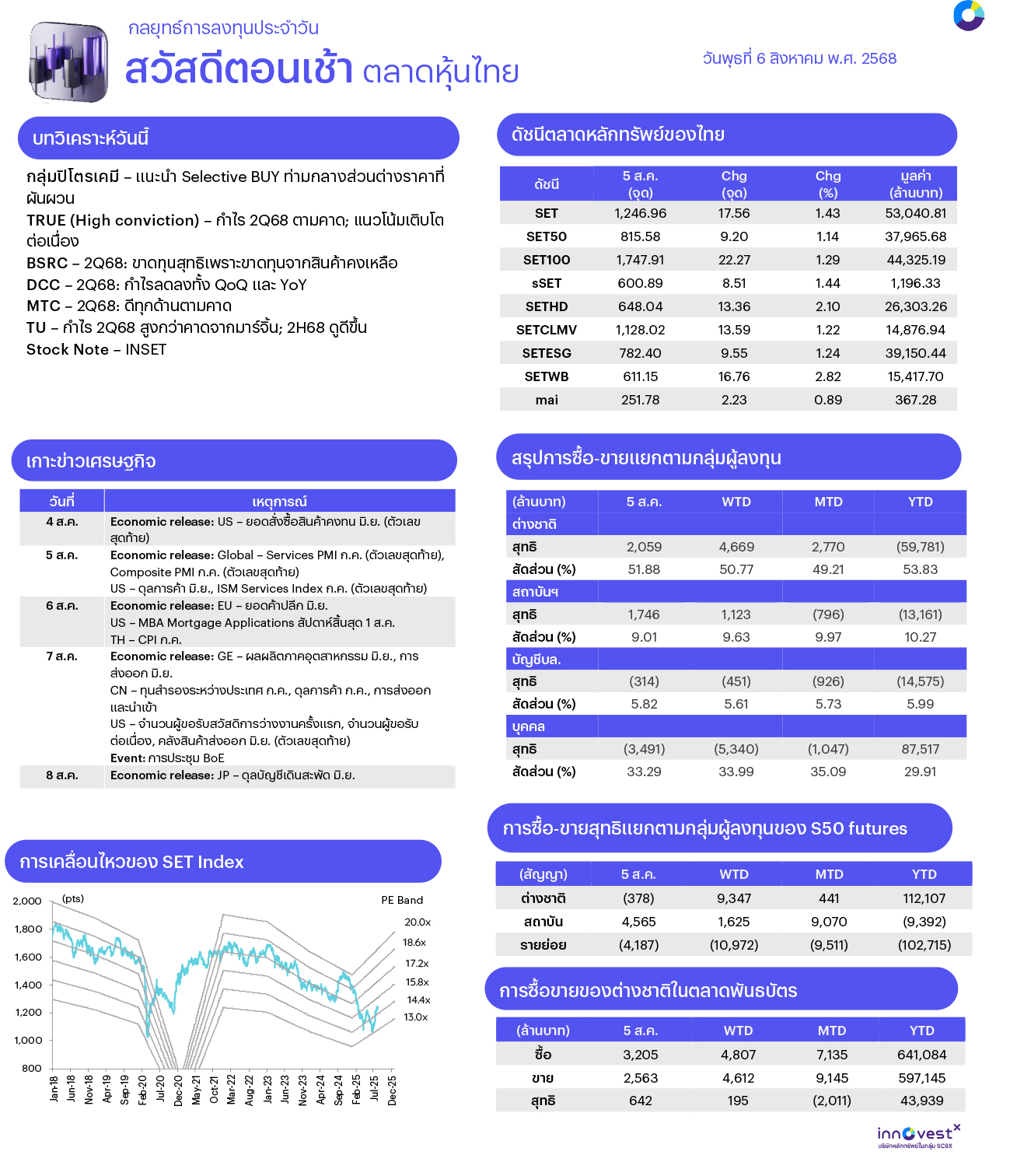 3. Trading Idea : สำหรับนักลงทุนที่รับความเสี่ยงได้และต้องการเก็งกำไร แนะนำ 1) หุ้น Laggard Play ซึ่งคาดได้อานิสงส์หาก Fund Flow ไหลเข้าต่อเนื่อง โดยเลือกหุ้น SET50 ซึ่งราคาหุ้นปรับขึ้น MTD ต่ำกว่า SET และ Valuation ถูก โดยมี PBV และ PER 2568F < -1SD อีกทั้งมีพื้นฐานดี (กำไรเติบโต, ฐานะการเงินแข็งแกร่ง และมี SET ESG Ratings A-AAA) แนะนำ BDMS CPALL MINT MTC PTT 2) กลุ่มค้าปลีกวัสดุก่อสร้างที่ได้ประโยชน์หลังจากน้ำท่วม และยอดขายสาขาเดิมมีสัญญาณฟื้นตัว โดยลดในอัตราที่น้อยลง แนะนำ GLOBAL HMPRO 3) หุ้นที่ได้ประโยชน์ดอกเบี้ยขาลง แนะนำ TIDLOR MTC SIRI ก่อนการประชุม กนง. ในวันที่ 13 ส.ค. นี้ และ 4) หุ้นฟื้นตัวเร็วหลังปลดล็อกปัญหาภาษีสหรัฐฯ ได้แก่ AMATA GPSC WHA DELTA