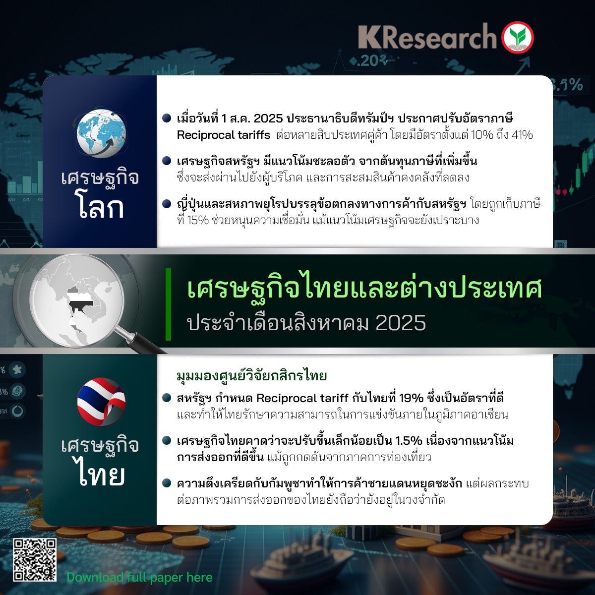 • เมื่อวันที่ 1 ส.ค. 2025 ประธานาธิบดีทรัมป์ฯ ประกาศปรับอัตราภาษี Reciprocal tariffs ต่อหลายสิบประเทศคู่ค้า โดยมีอัตราตั้งแต่ 10% ถึง 41%