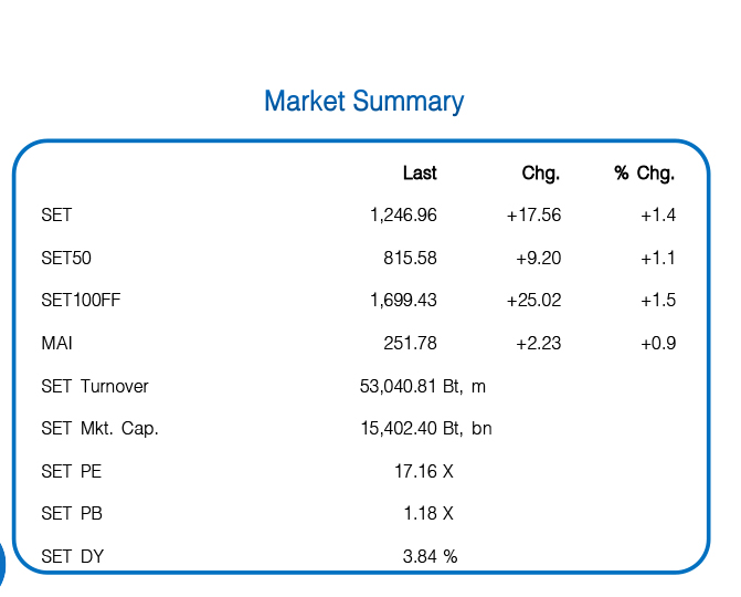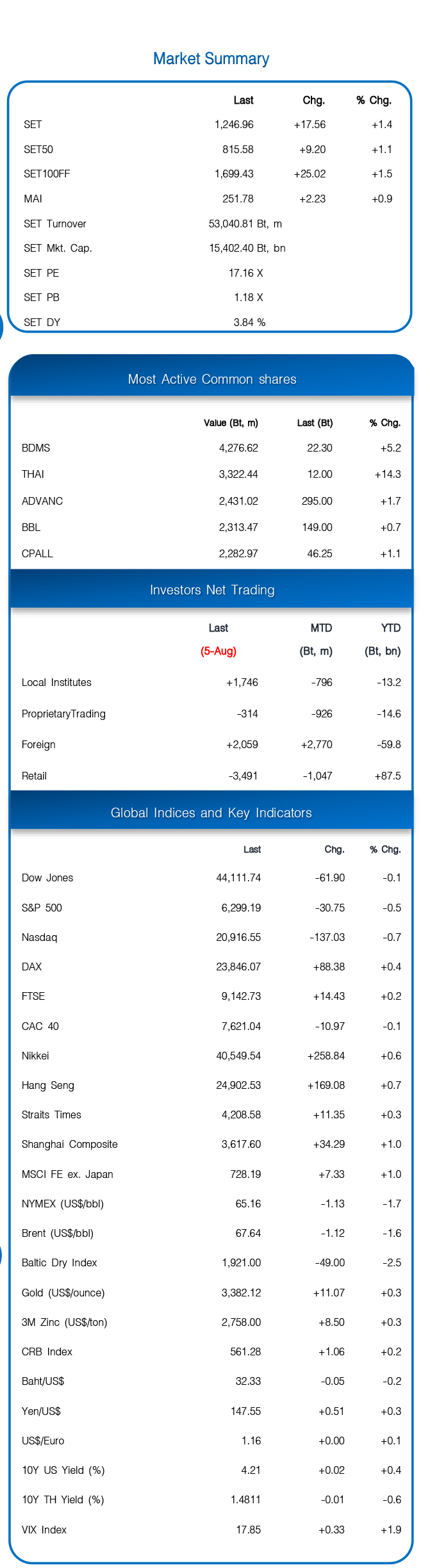 คาดหวัง FED ลดดบ. – SET แกว่งแดนบวกทั้งวันในกรอบ 1233-50 ปรับขึ้นตามทิศทางหุ้นโลก คาดหวัง FED จะลดดบ.ใน ก.ย. และมากขึ้นกว่าเดิมจาก 2 ครั้งเป็น 3 ครั้งในปีนี้ กด US10Y ร่วงแตะ 4.2% ต่ำสุดในรอบ 1 เดือนกว่า และเงินดอลล์อ่อนค่าหนุนต่างชาติซื้อสุทธิ 2.05 พันลบ. 2 วันติด แต่พลิก Short S50 Futures 378 สัญญา