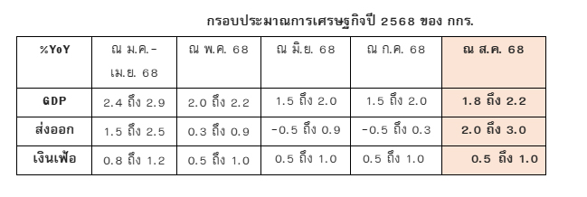 · เศรษฐกิจไทยปี 68 มีแนวโน้มขยายตัวได้ที่ 1.8-2.2% ปรับเพิ่มขึ้นจากประมาณการเดิมที่ 1.5-2.0% ส่วนการส่งออกมีแนวโน้มขยายตัว 2-3% สูงกว่าประมาณการเดิมเช่นกัน โดยความสำเร็จจากการเจรจาการค้าส่งผลให้ไทยถูกเรียกเก็บภาษีที่ 19% แทน 36% ซึ่งยังต้องให้ความสำคัญกับรายละเอียดที่ต้องมีการเจรจากันต่อไป เบื้องต้นทำให้ไทยไม่เสียเปรียบประเทศเพื่อนบ้านซึ่งเป็น worst case scenario อย่างไรก็ตาม เศรษฐกิจในครึ่งปีหลังมีแนวโน้มชะลอตัว โดยการส่งออกแผ่วลงหลังหมดปัจจัยชั่วคราวจากการเร่งส่งออก การแข่งขันด้านราคาที่มากขึ้น ค่าเงินบาทที่แข็งค่าขึ้นรวมถึงปัญหาเศรษฐกิจนอกระบบ และกำลังซื้อของผู้บริโภคสหรัฐฯที่ลดลงจากเงินเฟ้อ ส่วนรายได้จากการท่องเที่ยวชะลอตามจำนวนนักท่องเที่ยวต่างชาติโดยเฉพาะ short haul ที่ชะลอตัวรวมทั้งผลกระทบจากปัจจัยความขัดแย้งไทย-กัมพูชา ทั้งนี้เศรษฐกิจไตรมาสสุดท้ายของปีและต้นปีหน้าอาจมีความผันผวนสูง โดยเฉพาะภาคส่งออกที่จะได้รับผลกระทบจากภาษีสหรัฐฯชัดเจน และการแข่งขันที่สูงขึ้นจากประเทศคู่แข่ง ซึ่งแตกต่างกันในแต่ละประเภทสินค้าและการจัดเก็บ Stock คงค้างที่ไม่เท่ากัน