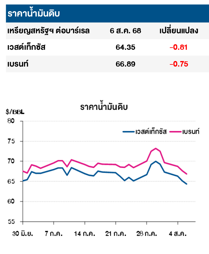 (-) ราคาน้ำมันยังถูกกดดันจากที่ OPEC+ มีแผนเพิ่มกำลังการผลิตน้ำมันดิบในเดือน ก.ย. 68 ซึ่งจะส่งผลต่ออุปทานเพิ่มขึ้น