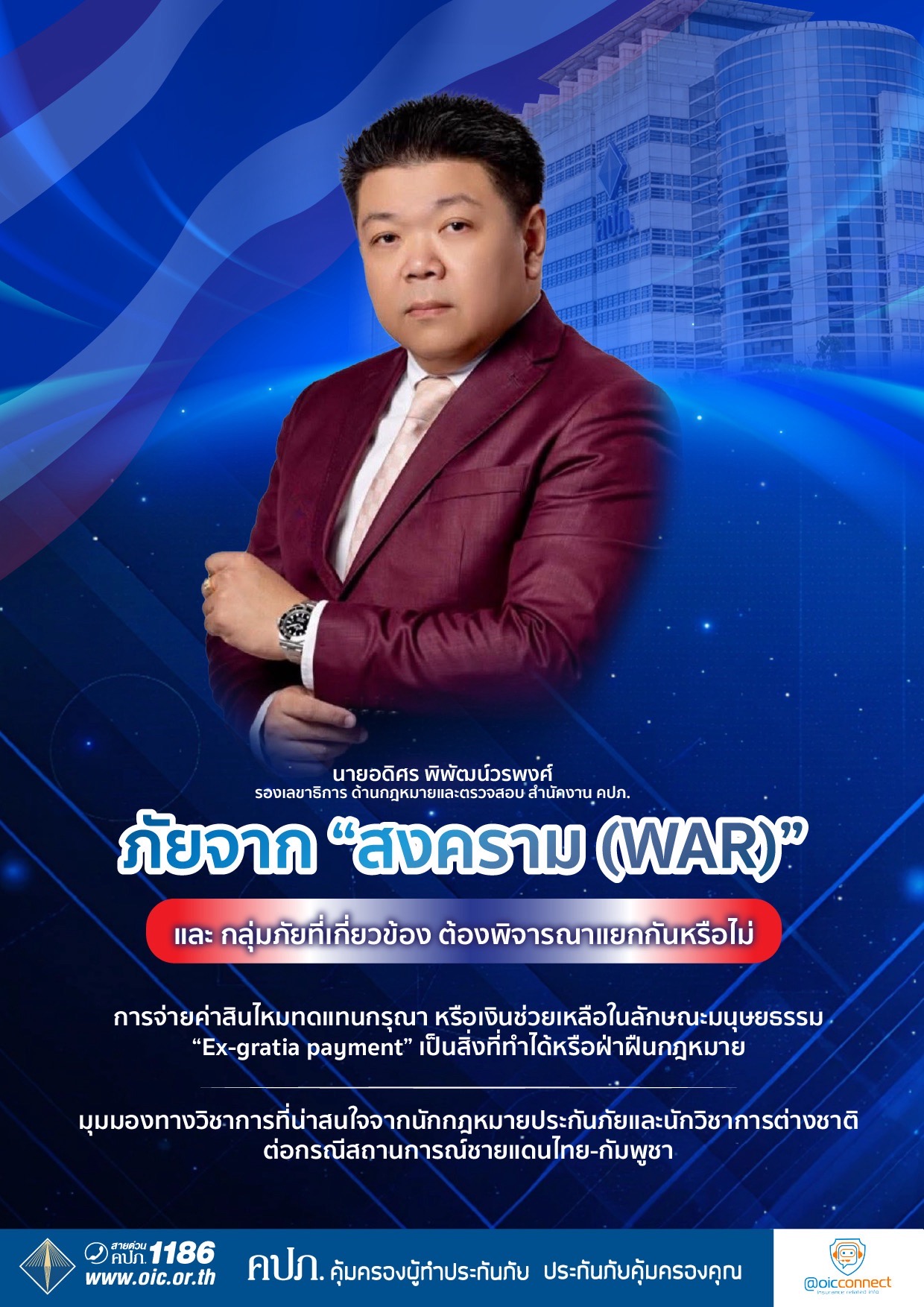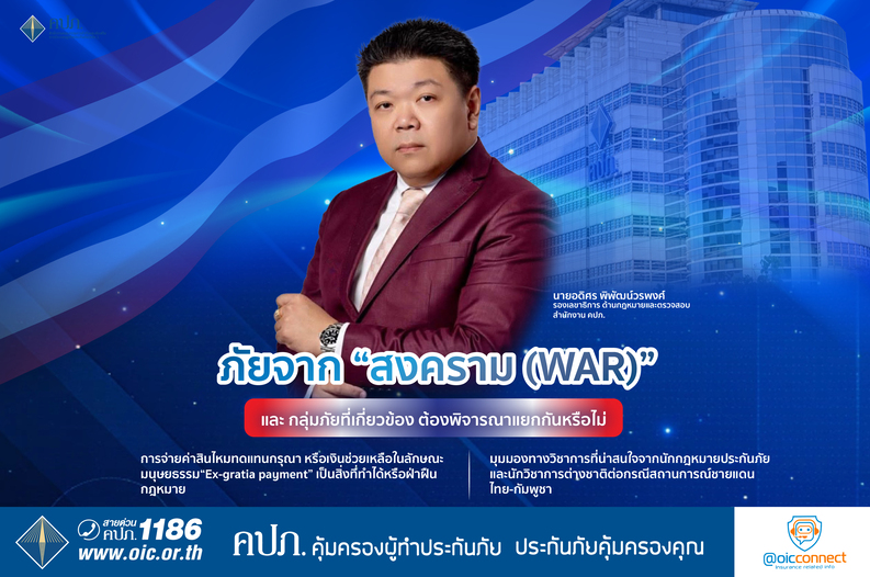 1. ความเห็นของสำนักงาน คปภ. ที่มีการสื่อสารออกไปว่า สถานการณ์ปะทะบริเวณชายแดนไทย-กัมพูชา ในขณะนี้ยังไม่เข้าข่ายคำว่า “สงคราม (War)” เนื่องจากมีคำถามตรงเข้ามาเป็นจำนวนมากว่า กรณีดังกล่าวถือเป็น “สงคราม (War)” แล้วหรือไม่ทั้งนี้ เนื่องจากยังไม่มีความชัดเจนว่ากรณีดังกล่าว เป็นที่ยอมรับในทางระหว่างประเทศว่าสถานการณ์ที่เกิดขึ้น มีองค์ประกอบครบถ้วนและรุนแรงจนถึงขนาดเป็น “สงคราม (War)”