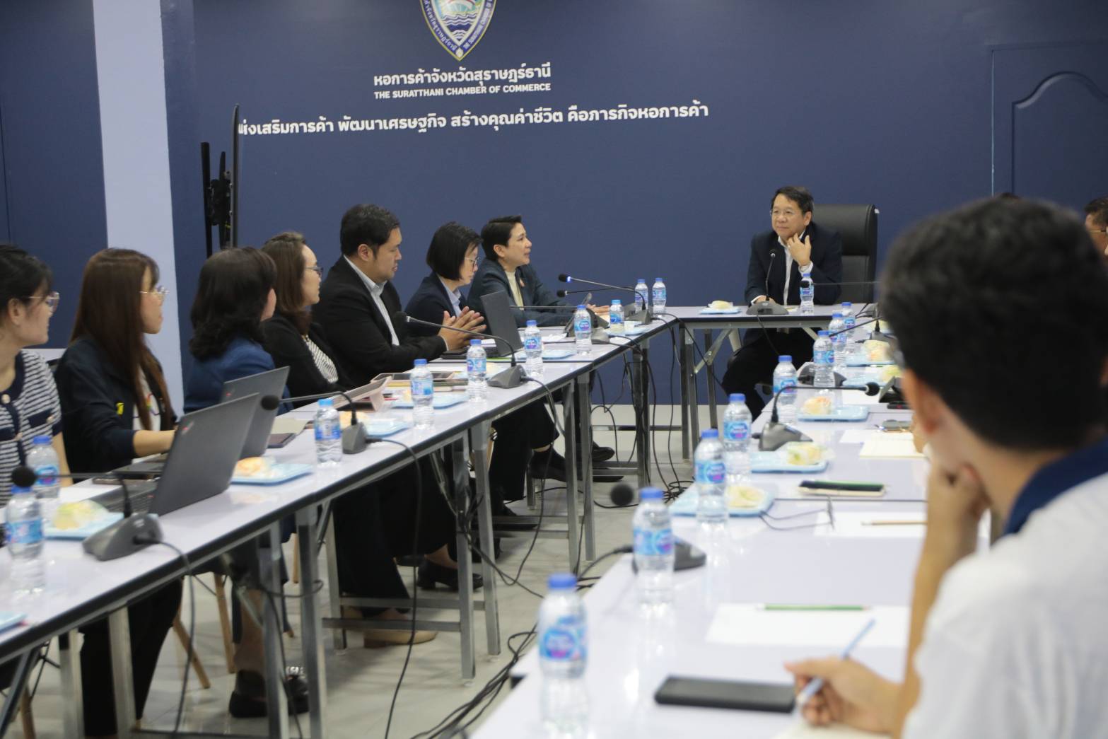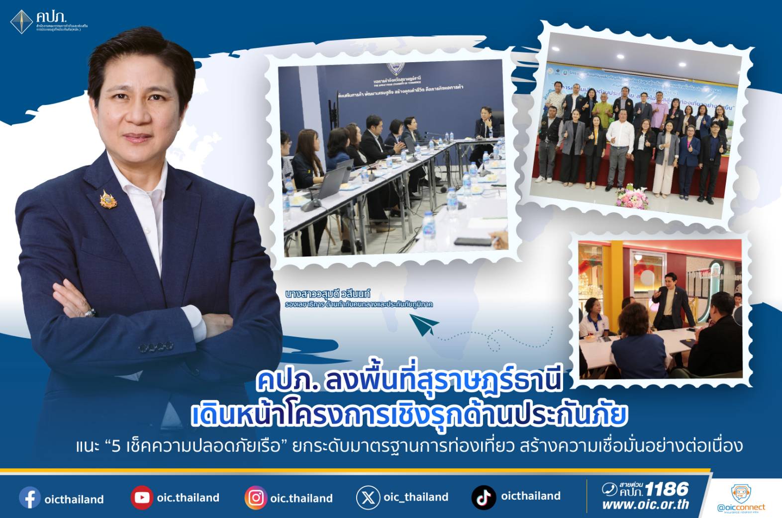 เมื่อวันที่ 6 สิงหาคม 2568 นางสาววสุมดี วสีนนท์ รองเลขาธิการ ด้านกำกับคนกลางและประกันภัยภูมิภาค สำนักงานคณะกรรมการกำกับและส่งเสริมการประกอบธุรกิจประกันภัย (สำนักงาน คปภ.) นำคณะผู้บริหารสายส่งเสริมและประกันภัยภูมิภาค ลงพื้นที่จังหวัดสุราษฎร์ธานี เพื่อขับเคลื่อน “โครงการส่งเสริมประกันภัยเชิงรุกสู่ระดับภูมิภาคอย่างยั่งยืน” โดยภารกิจแรก คือ การประชุมหารือร่วมกับหอการค้าจังหวัดสุราษฎร์ธานี และชมรมผู้ประกอบการในพื้นที่ เพื่อหาแนวทางบูรณาการความร่วมมือและขยายเครือข่ายพันธมิตรนำระบบประกันภัยเข้าไปช่วยบริหารความเสี่ยงแก่ธุรกิจและประชาชนผู้บริโภค พร้อมทั้งประชุมร่วมกับตัวแทน/นายหน้าประกันภัย และบริษัทประกันภัยภายในพื้นที่ เพื่อแลกเปลี่ยนแนวคิดการส่งเสริมการ เข้าถึงประกันภัย และพัฒนาผลิตภัณฑ์ให้สอดคล้องกับบริบทของพื้นที่ภาคใต้ตอนบน รวมถึงการขยายความคุ้มครองให้ครอบคลุมยิ่งขึ้น