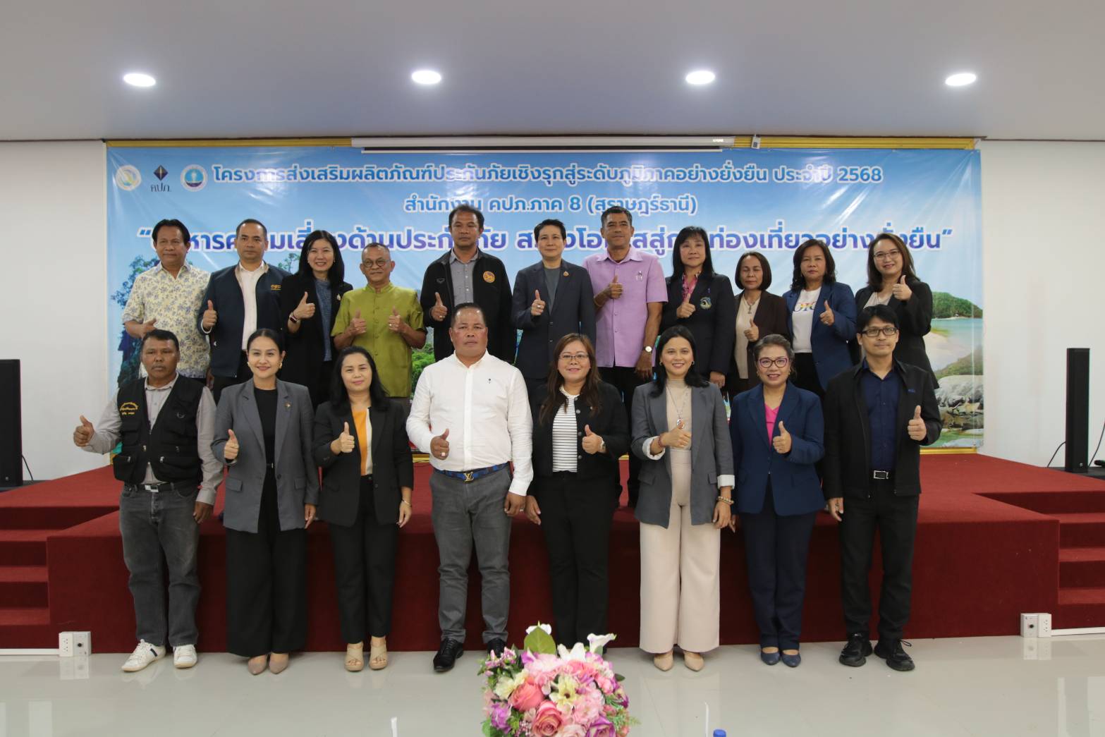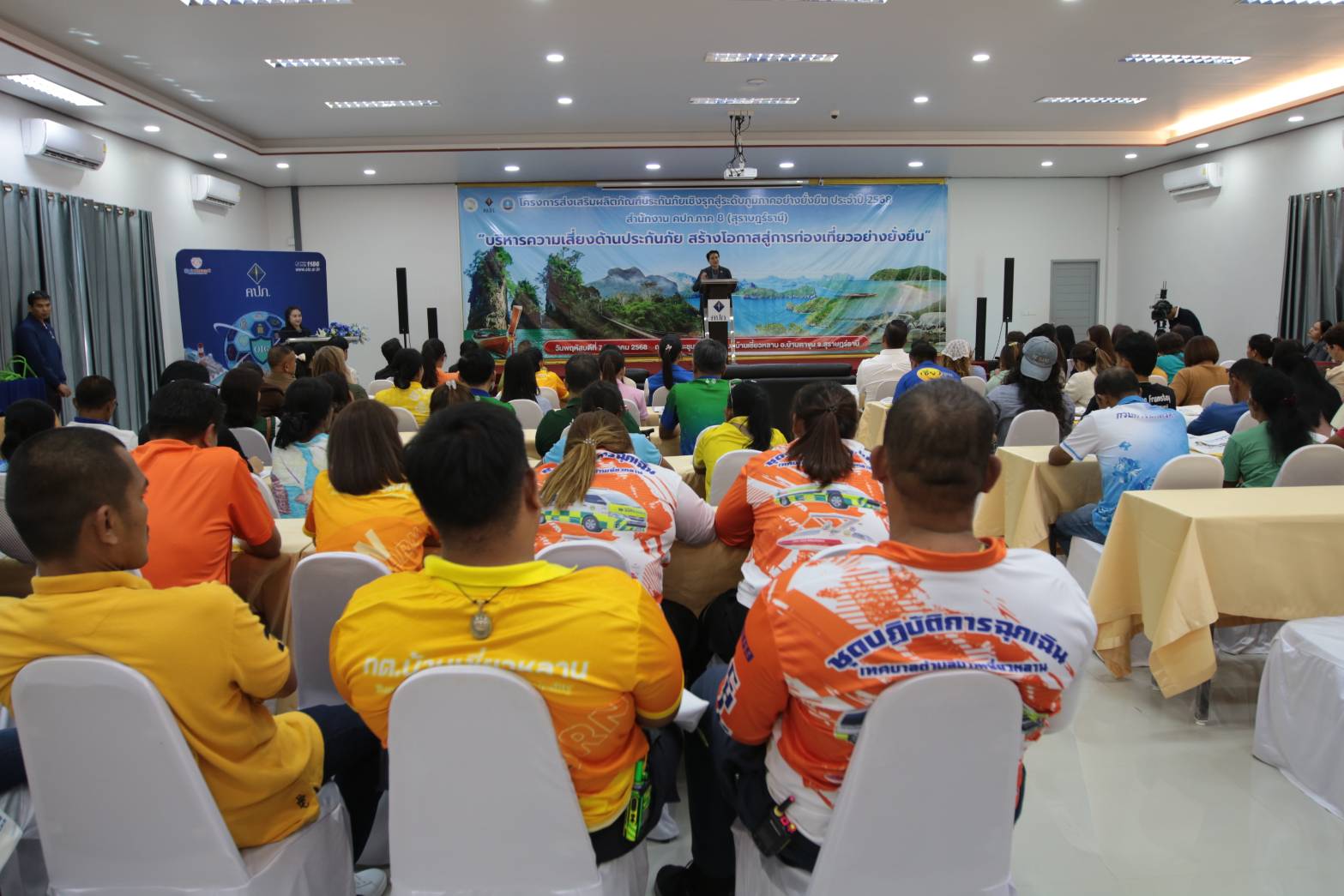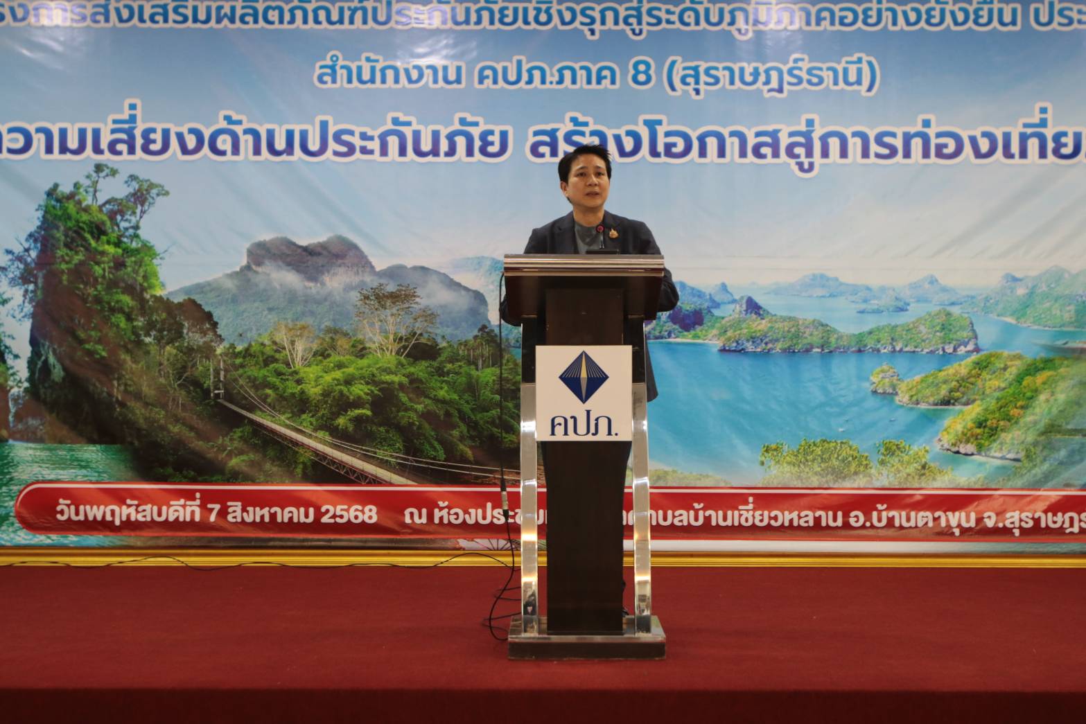 ต่อมา รองเลขาธิการฯ ได้ให้เกียรติเป็นประธานเปิดโครงการดังกล่าวฯ ซึ่งจัดโดยสำนักงาน คปภ. ภาค 8 สุราษฎร์ธานี ณ ห้องประชุมเทศบาลตำบลบ้านเชี่ยวหลาน อำเภอบ้านตาขุน โดยกล่าวว่า ภาคการท่องเที่ยวเป็นกลไกสำคัญในการขับเคลื่อนเศรษฐกิจ สร้างรายได้ สร้างงาน และกระตุ้นการพัฒนาชุมชนในทุกภูมิภาค แต่ก็ยังเผชิญความเสี่ยงจากภัยธรรมชาติ อุบัติเหตุ หรือเหตุการณ์ไม่คาดคิด ซึ่งอาจกระทบทั้งผู้ประกอบการ นักท่องเที่ยว และภาพลักษณ์ของประเทศ การส่งเสริมให้ผู้ประกอบการมีความรู้ความเข้าใจในการใช้ระบบประกันภัยเพื่อบริหารจัดการความเสี่ยง จึงเป็นเครื่องมือสำคัญในการเสริมศักยภาพ ลดความเสียหาย และสร้างเสถียรภาพแก่ธุรกิจ ซึ่งจะนำไปสู่การพัฒนาการท่องเที่ยวอย่างต่อเนื่องและยั่งยืน สำหรับจังหวัดสุราษฎร์ธานี ถือเป็นพื้นที่ที่มีศักยภาพสูง ทั้งโครงสร้างพื้นฐาน แหล่งท่องเที่ยวระดับนานาชาติ และสิ่งอำนวยความสะดวกครบครัน โดยในปี 2567 มีรายได้จากนักท่องเที่ยวรวมกว่า 92,154 ล้านบาท สะท้อนบทบาทสำคัญในการขับเคลื่อนเศรษฐกิจของพื้นที่และภูมิภาค ทั้งนี้ ภายใต้โครงการฯ ได้จัดให้มีการเสวนาภายใต้หัวข้อ “บริหารความเสี่ยงด้วยการประกันภัย สร้างโอกาสสู่การท่องเที่ยวที่มั่นคงและปลอดภัย” โดยมีผู้แทนจาก 5 หน่วยงาน ได้แก่ สำนักงานการท่องเที่ยวและกีฬาจังหวัดสุราษฎร์ธานี สำนักงานทะเบียนธุรกิจนำเที่ยวและมัคคุเทศก์ สาขาภาคใต้ เขต 1 ชมรมผู้ประกอบการเรือเขื่อนรัชชประภา ชมรมประกันวินาศภัยจังหวัดสุราษฎร์ธานี และสำนักงาน คปภ. จังหวัดภูเก็ต ร่วมแลกเปลี่ยนความคิดเห็นเพื่อบูรณาการยกระดับมาตรฐานการท่องเที่ยวในพื้นที่