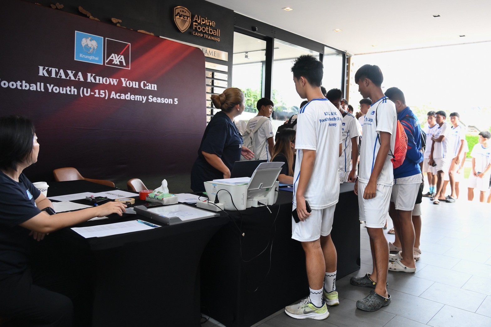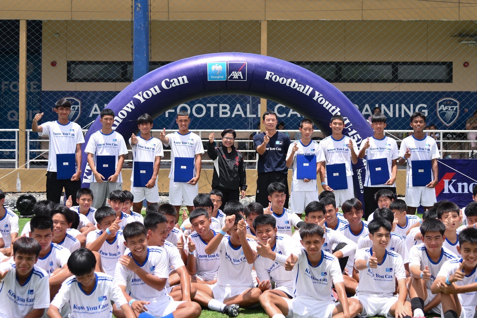 บมจ.กรุงไทย-แอกซ่า ประกันชีวิต นำโดย คุณบุปผาวดี โอวรารินท์ ประธานเจ้าหน้าที่บริหาร ฝ่ายการตลาด (คนที่ 5 จากซ้าย) จัดกิจกรรม "KTAXA Know You Can Football Youth (U15) Academy ปีที่ 5" สนามสุดท้าย ภาคกลาง ณ สนามอัลไพน์ ฟุตบอล แคมป์ เทรนนิ่ง กรุงเทพ ซึ่งได้รับการตอบรับเป็นอย่างดี โดยมีเยาวชนชายหญิงอายุระหว่าง 13-15 ปี เข้าร่วมกิจกรรมกว่า 600 คน เพื่อคัดเลือกสุดยอดเยาวชนไทยที่มีทักษะในกีฬาฟุตบอล สำหรับเยาวชนที่ผ่านการคัดเลือกจะได้รับทุนการศึกษามูลค่ารวมกว่า 200,000 บาท พร้อมรับกรมธรรม์ประกันสุขภาพโรคร้ายแรง ทุนประกันรวมมูลค่ากว่า 5,000,000 บาท