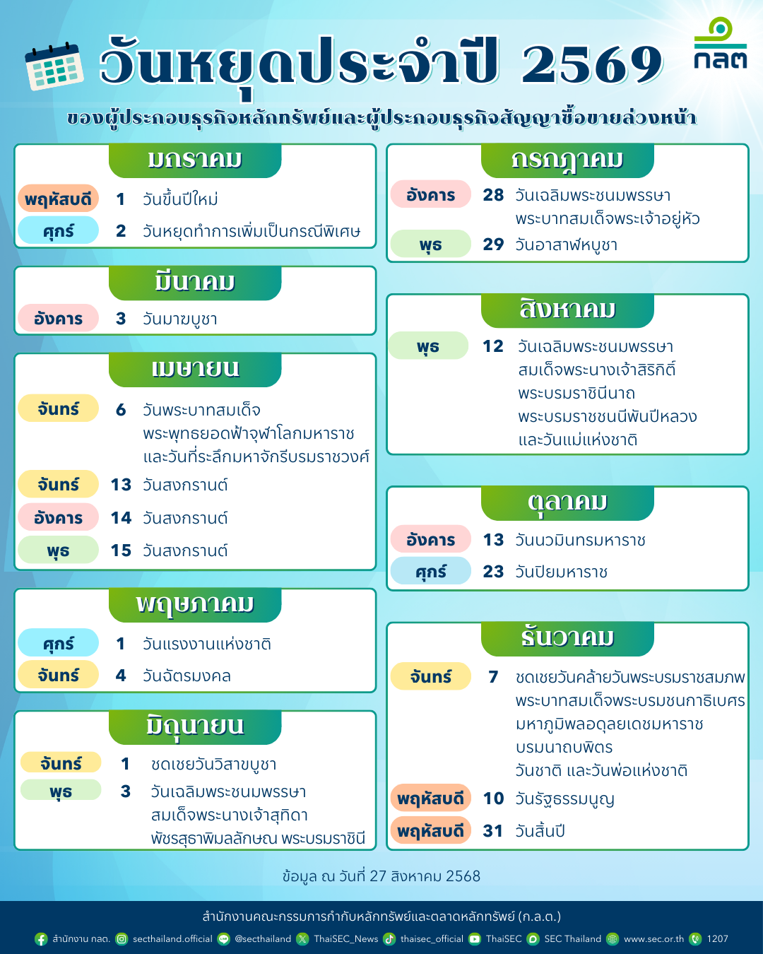 สำนักงานคณะกรรมการกำกับหลักทรัพย์และตลาดหลักทรัพย์ (ก.ล.ต.) ออกประกาศกำหนดวันหยุดทำการของผู้ประกอบธุรกิจหลักทรัพย์และผู้ประกอบธุรกิจสัญญาซื้อขายล่วงหน้า ประจำปี พ.ศ. 2569 ดังต่อไปนี้