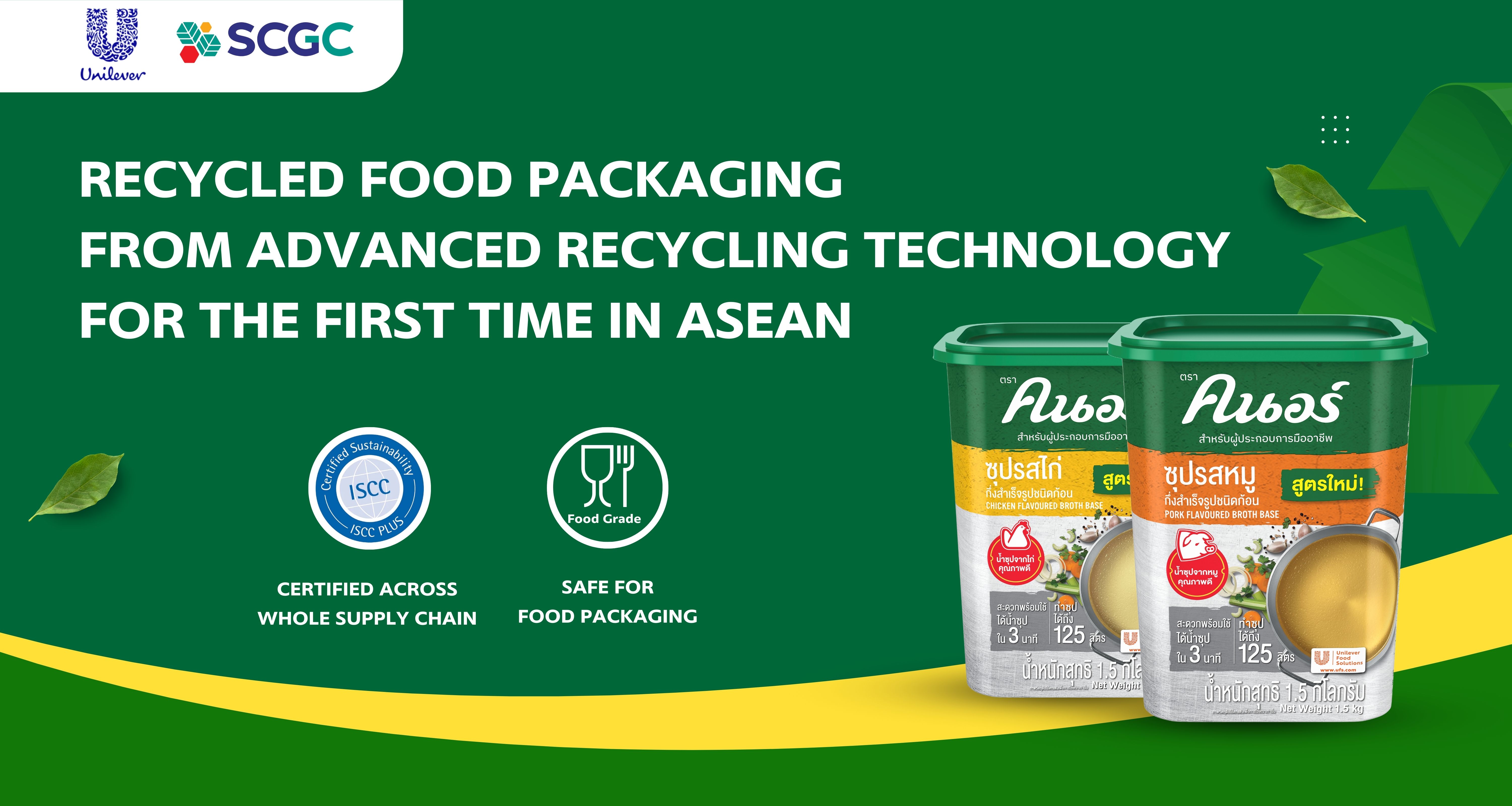 กลุ่มบริษัท ยูนิลีเวอร์ ประเทศไทย หรือ Unilever ผู้ผลิตสินค้าอุปโภคบริโภครายใหญ่ระดับโลก ร่วมกับ เอสซีจี เคมิคอลส์ หรือ SCGC ผู้นำธุรกิจพอลิเมอร์และโซลูชันครบวงจรเพื่อความยั่งยืน เปิดตัวบรรจุภัณฑ์รีไซเคิล แบรนด์ “คนอร์ สำหรับผู้ประกอบการมืออาชีพ” (Knorr Professional) ครั้งแรกในอาเซียน โดยพัฒนาบรรจุภัณฑ์รีไซเคิลชนิดฟู้ดเกรด (Food Grade) หรือ เกรดอาหารปลอดภัย ด้วยเทคโนโลยีรีไซเคิลขั้นสูง หรือ Advanced Recycling จาก SCGC GREEN POLYMERTM สามารถเปลี่ยนพลาสติกใช้แล้วให้เป็นวัตถุดิบตั้งต้น (Circular Naphtha) โดยนำมาผลิตเป็นเม็ดพลาสติกใหม่ (Certified Circular Polyolefin Resin) ซึ่งมีคุณสมบัติเทียบเท่าเม็ดพลาสติกทั่วไป ผ่านการรับรองมาตรฐาน ISCC PLUS ครอบคลุมตลอดห่วงโซ่อุปทาน รายแรกของอุตสาหกรรมปิโตรเคมีในประเทศไทย จึงสามารถใช้ผลิตบรรจุภัณฑ์อาหารได้อย่างปลอดภัย ไม่มีสารเคมีหรือสารตกค้างที่อาจก่อให้เกิดอันตรายต่อร่างกาย หรือปนเปื้อนในอาหาร ถือเป็นบรรจุภัณฑ์อาหารจากกระบวนการรีไซเคิลขั้นสูงครั้งแรกในอาเซียน ซึ่งขณะนี้ ยูนิลีเวอร์ได้วางจำหน่ายผลิตภัณฑ์คนอร์ สำหรับผู้ประกอบการมืออาชีพ ที่ผลิตจากบรรจุภัณฑ์รักษ์โลกในประเทศไทยและเวียดนาม