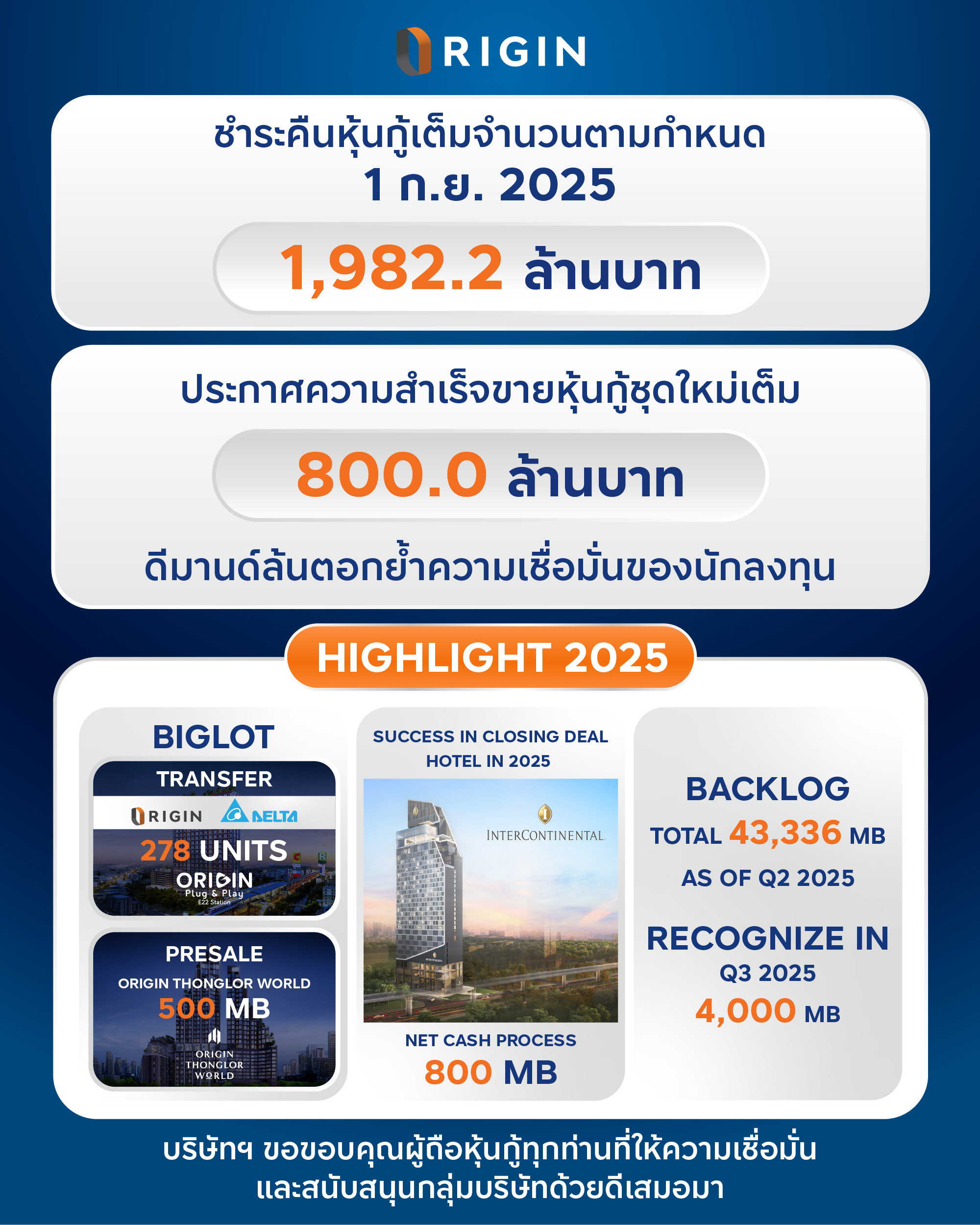 ออริจิ้น พร็อพเพอร์ตี้ ชำระคืนหุ้นกู้เต็มจำนวน 1,982.20 ล้านบาท ตามกำหนด 1 กันยายน 2568 สะท้อนถึงสถานะทางการเงินที่แข็งแกร่ง พร้อมทั้งประกาศความสำเร็จขายหุ้นกู้ 800 ล้านบาท ดีมานด์ล้นกว่า 1.5 เท่า ตอกย้ำความเชื่อมั่นของนักลงทุน จ่อบุ๊ครายได้ในไตรมาส 3/2568 จากการปิดดีล ขายหุ้นโรงแรม อินเตอร์คอนติเนนตัล แบงค็อก สุขุมวิท และจากโครงการคอนโดฯที่เสร็จใหม่ เริ่มทยอยโอนกรรมสิทธิ์เพิ่มอีก 4 โครงการ ตุน Backlog คอนโดฯ แล้วกว่า 4,000 ล้านบาท