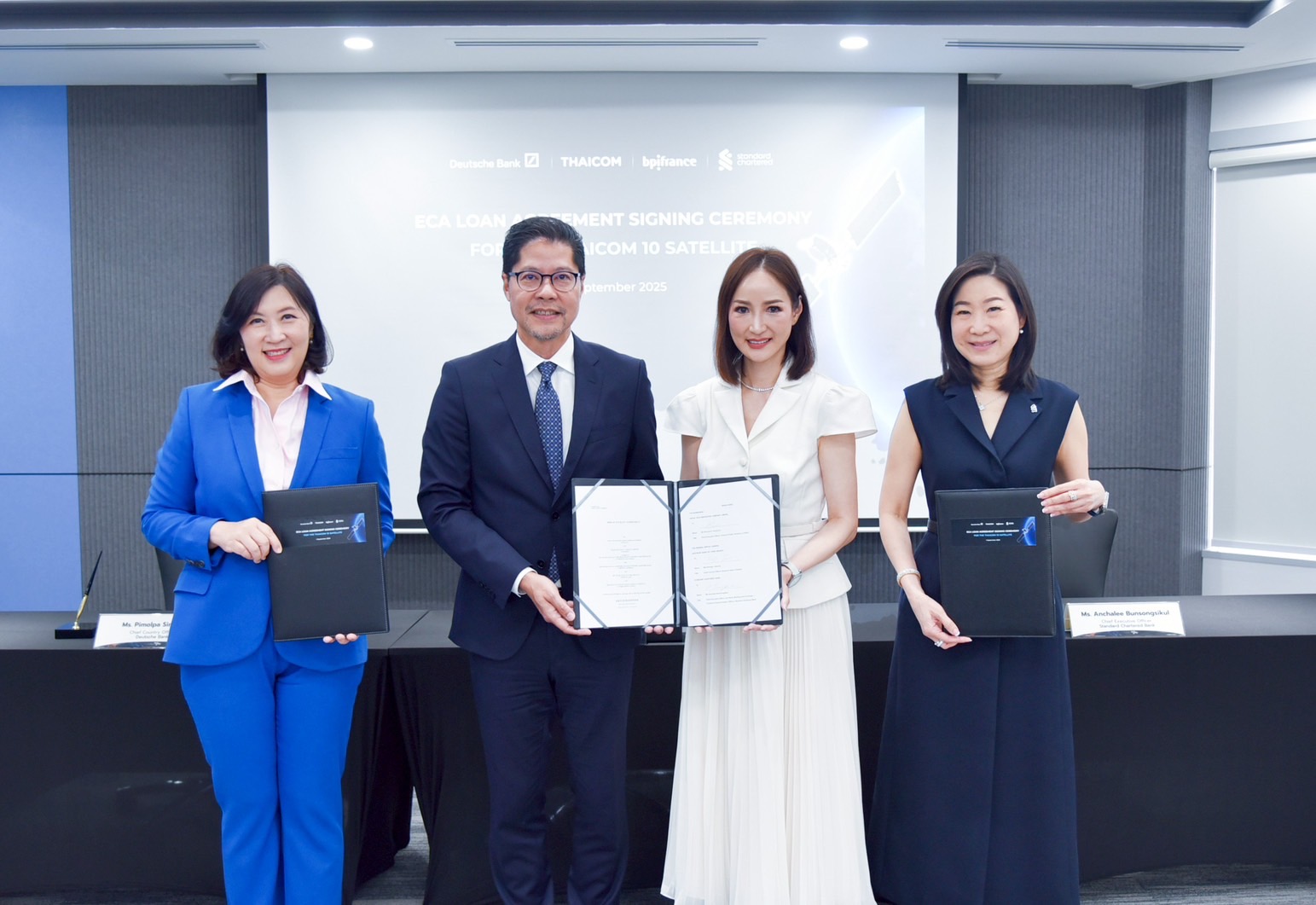 นางสาวภิมลภา สิมะโรจน์ Chief Country Officer (CCO) of Deutsche Bank Thailand กล่าวว่า “ธนาคารมีความยินดีเป็นอย่างยิ่งที่ได้มีส่วนร่วมในการสนับสนุนสินเชื่อโครงการดาวเทียมไทยคม 10 ซึ่งถือเป็นการทำธุรกรรมด้านสินเชื่อผ่าน ECA ครั้งแรกในรอบหลายปีของธนาคารดอยซ์แบงก์ ประเทศไทย ด้วยแผนกลยุทธ์ที่ชัดเจนและศักยภาพของดาวเทียมดวงใหม่นี้ ไทยคมได้แสดงให้เห็นถึงความพร้อมในการเป็นผู้นำในธุรกิจดาวเทียมระดับภูมิภาค เราเชื่อมั่นว่าเงินทุนที่ได้รับจะถูกนำไปใช้ในการขับเคลื่อนธุรกิจให้เติบโตอย่างมีประสิทธิภาพ”