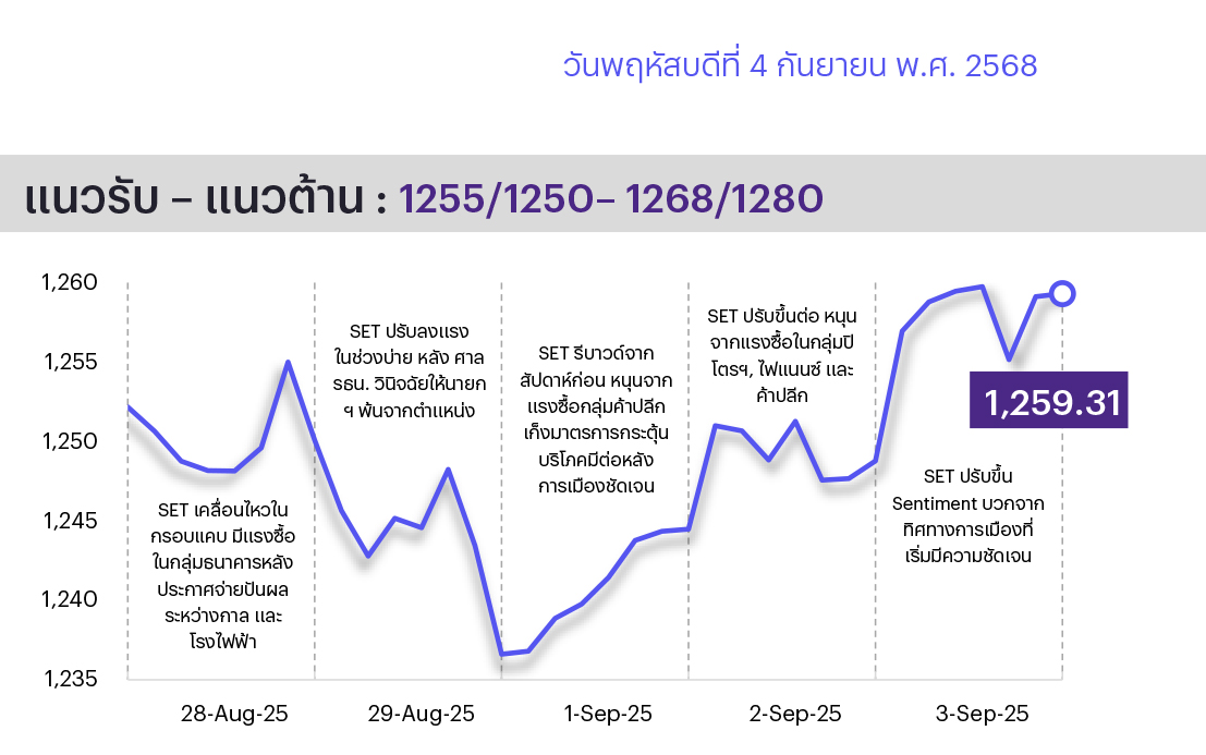 คาดตลาดแกว่งตัวขึ้น มีความชัดเจนในการจัดตั้งรัฐบาล ประธานสภาฯ บรรจุวันโหวตนายกฯ 5 ก.ย.นี้ พร้อมติดตามตัวเลขเงินเฟ้อไทยวันนี้ หากลดลงต่อเป็นเดือนที่ 5 จะหนุนโอกาส กนง. ลดดอกเบี้ยเพิ่ม ทางเทคนิคดัชนีกลับมายืนเหนือ 1250/1255 ได้ถือเป็นสัญญาณบวก การยืนได้ต่อเนื่องมีโอกาสจบการพักฐาน ทดสอบแนวต้านถัดไปที่ 1268/1280 ขณะที่การลงหากยังเป็นบวกไม่ควรหลุด 1255/1250 อีก