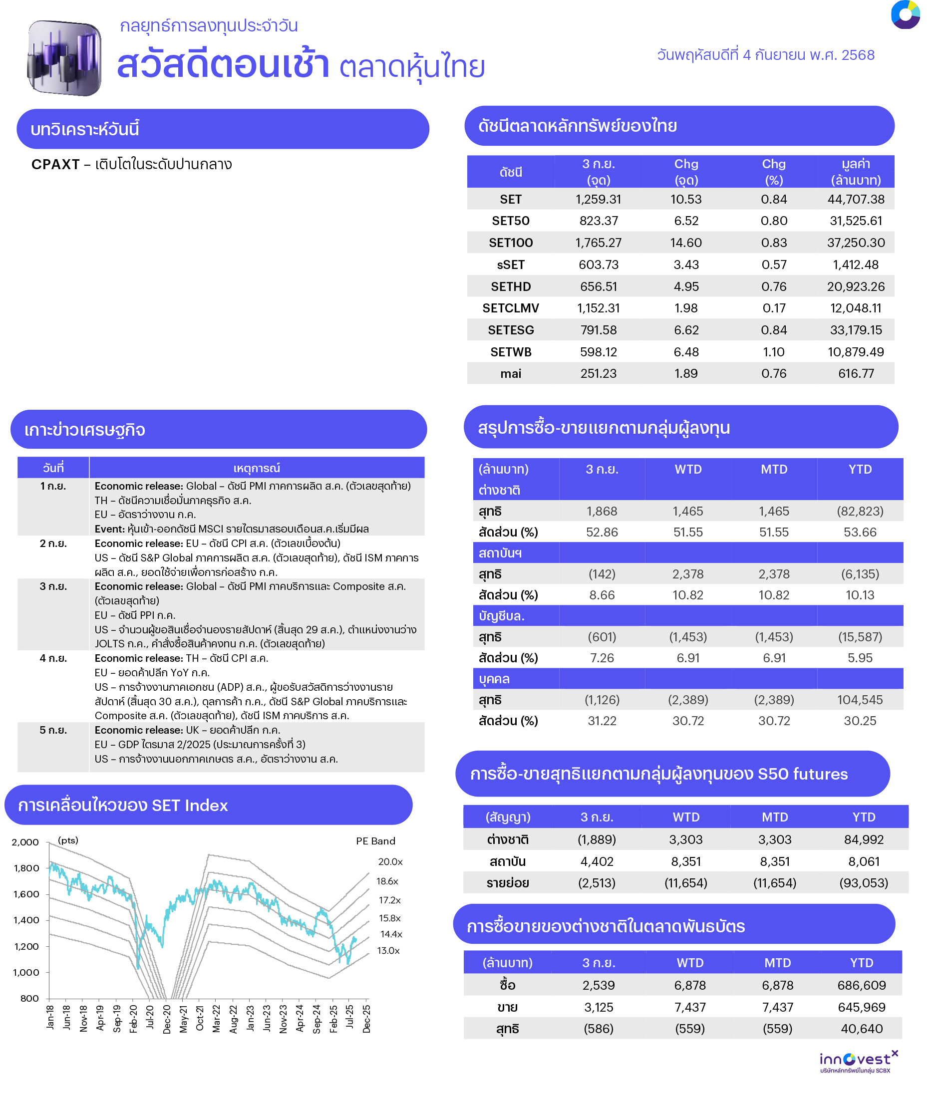 ช่วงสั้นมอง SET จะเคลื่อนไหว Sideways และบรรยากาศการลงทุนอยู่ในโหมดระมัดระวังหรือรอความชัดเจน เนื่องจากอยู่ระหว่างติตดามเสถียรภาพทางการเมืองไทย ทำให้ความเชื่อมั่นการลงทุนยังไม่กลับมาเต็มที่ อีกทั้งยังจับตาการประกาศตัวเลขเศรษฐกิจสำคัญ อาทิ เงินเฟ้อ ส.ค. ไทย ซึ่งหากยังลบต่อเนื่องเป็นเดือนที่ 5 อาจจะหนุนให้ตลาดเก็งการปรับลดดอกเบี้ยต่อ รวมทั้งดัชนี PMI การผลิตและการบริการ ส.ค. จีนและสหรัฐฯ, ดุลการค้าและตัวเลขการจ้างงานของสหรัฐฯ ซึ่งหากยังไม่กลับมาแข็งแกร่งมากอย่างมีนัยสำคัญ คาดตลาดจะประเมินว่าเฟดจะลดดอกเบี้ยใน ก.ย. ต่อ และจะมีผลต่อการเคลื่อนไหวของตลาดหุ้นโลก กลยุทธ์ลงทุนจึงคงแนะนำให้ “Selective Buy”