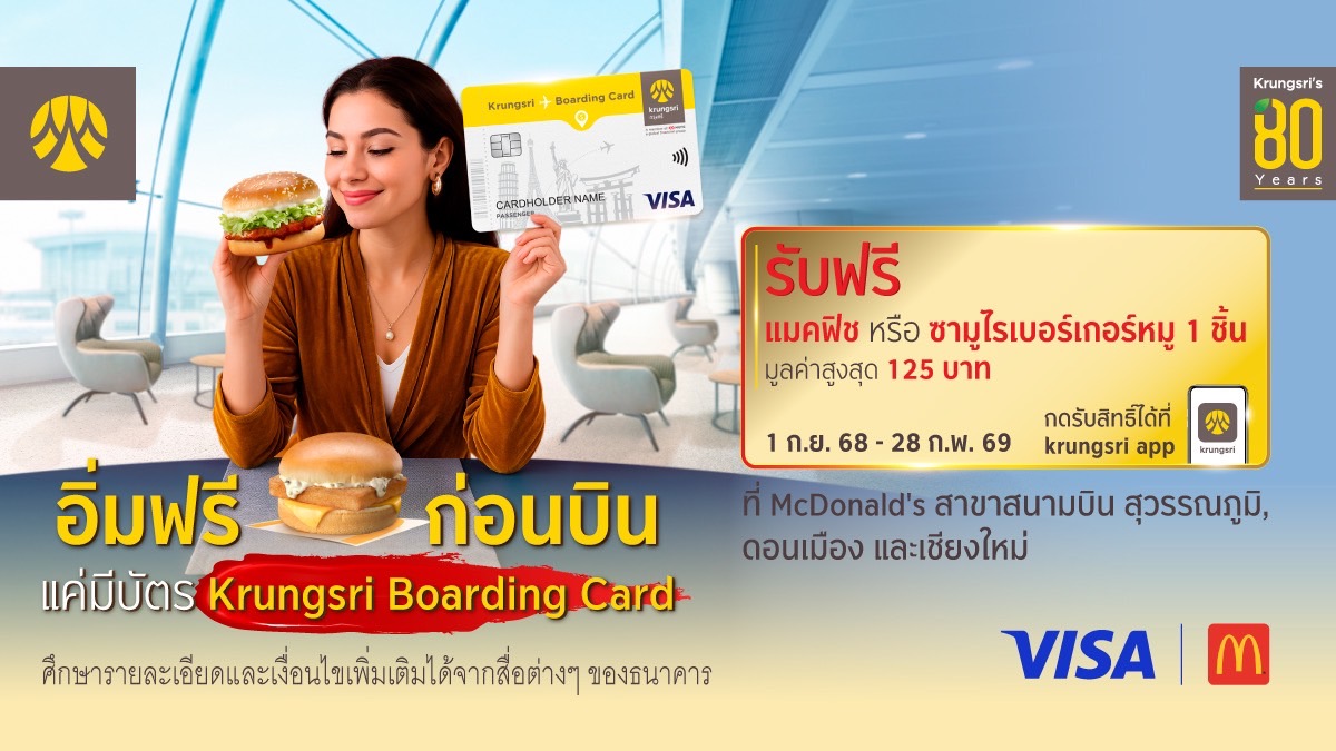 กรุงศรี (ธนาคารกรุงศรีอยุธยา จำกัด (มหาชน)) มอบสิทธิพิเศษสำหรับผู้ถือบัตร Krungsri Boarding Card ที่สมัครและเปิดใช้บัตร (Activate card) ก่อนวันที่ 1 กันยายน 2568 และยังคงสถานะการใช้งานอยู่ รับฟรี แมคฟิช หรือ ซามูไรเบอร์เกอร์หมู 1 ชิ้น มูลค่าสูงสุด 125 บาท ที่ McDonald's สาขาสนามบิน สุวรรณภูมิ, ดอนเมือง และเชียงใหม่ โดยสามารถกดรับสิทธิ์ผ่าน krungsri app เมนูสิทธิประโยชน์ ภายในระยะเวลาที่กำหนด พร้อมแสดงบัตร Krungsri Boarding Card เพื่อรับสิทธิ์กับพนักงานของ McDonald's ตั้งแต่วันที่ 1 กันยายน 2568 – 28 กุมภาพันธ์ 2569