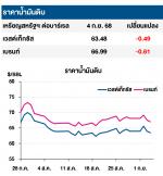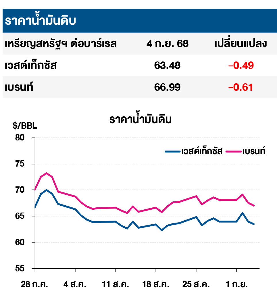 (-) ราคาน้ำมันดิบปรับลดลง หลังสำนักงานสารสนเทศด้านพลังงานสหรัฐฯ (EIA) เปิดเผยตัวเลขน้ำมันดิบคงคลังสหรัฐฯ ประจำสัปดาห์สิ้นสุด ณ วันที่ 29 ส.ค. 68 เพิ่มขึ้น 2.4 ล้านบาร์เรล สู่ระดับ 420.7 ล้านบาร์เรล สวนทางกับที่นักวิเคราะห์คาดการณ์ว่าจะปรับลดลง 2.0 ล้านบาร์เรล สะท้อนถึงอุปสงค์ที่อ่อนแอ