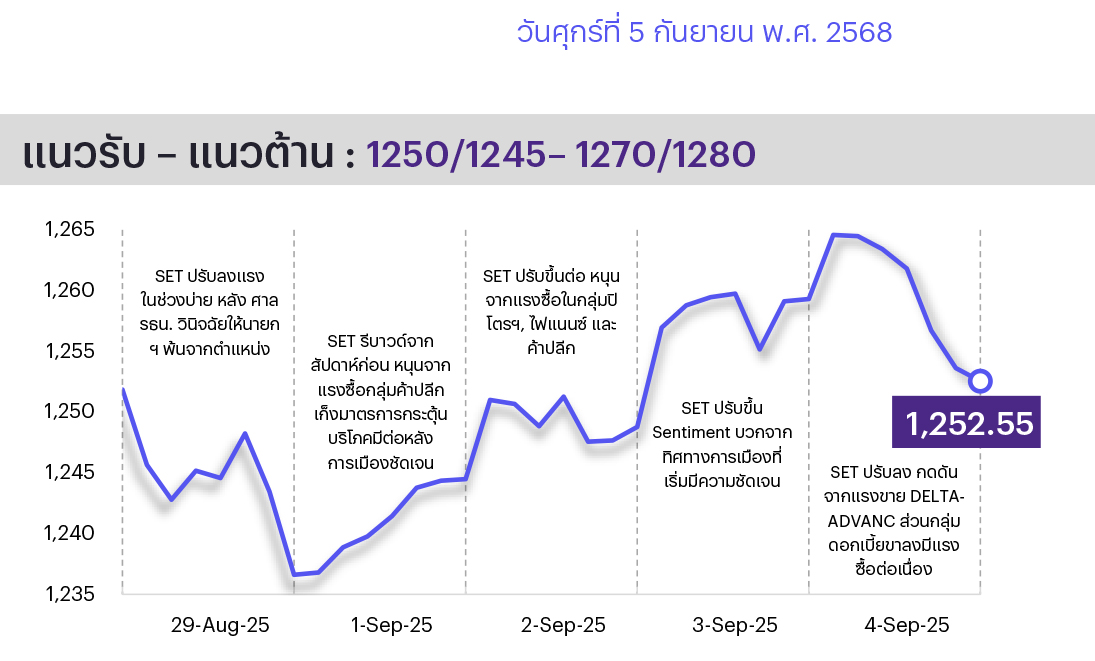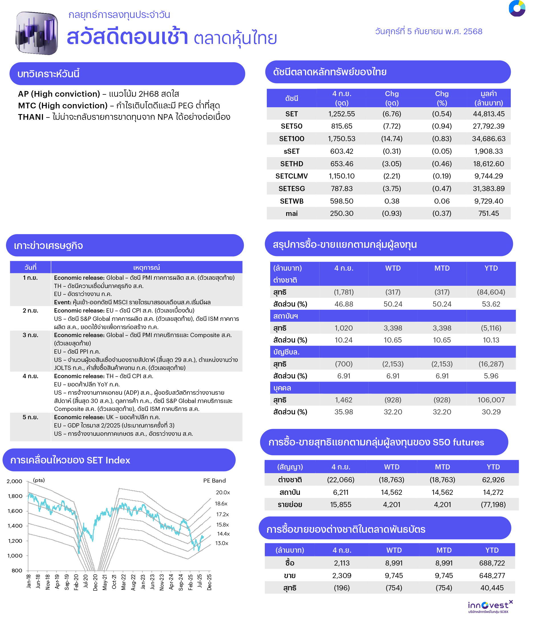 • อินเดียประกาศลดอัตราภาษีอุปโภคบริโภคสำหรับสินค้ากว่าร้อยรายการ เพื่อหนุนการบริโภคในประเทศและตั้งรับผลกระทบจากมาตรการภาษีสหรัฐฯ มองเป็น Sentiment เชิงบวกต่อหุ้นที่มีรายได้จาก นทท. อินเดีย ได้แก่ AAV, AOT, THAI, ERW, AWC และ CENTEL และหุ้นที่มีการลงทุนในอินเดีย PTTGC, IVL และ GPSC