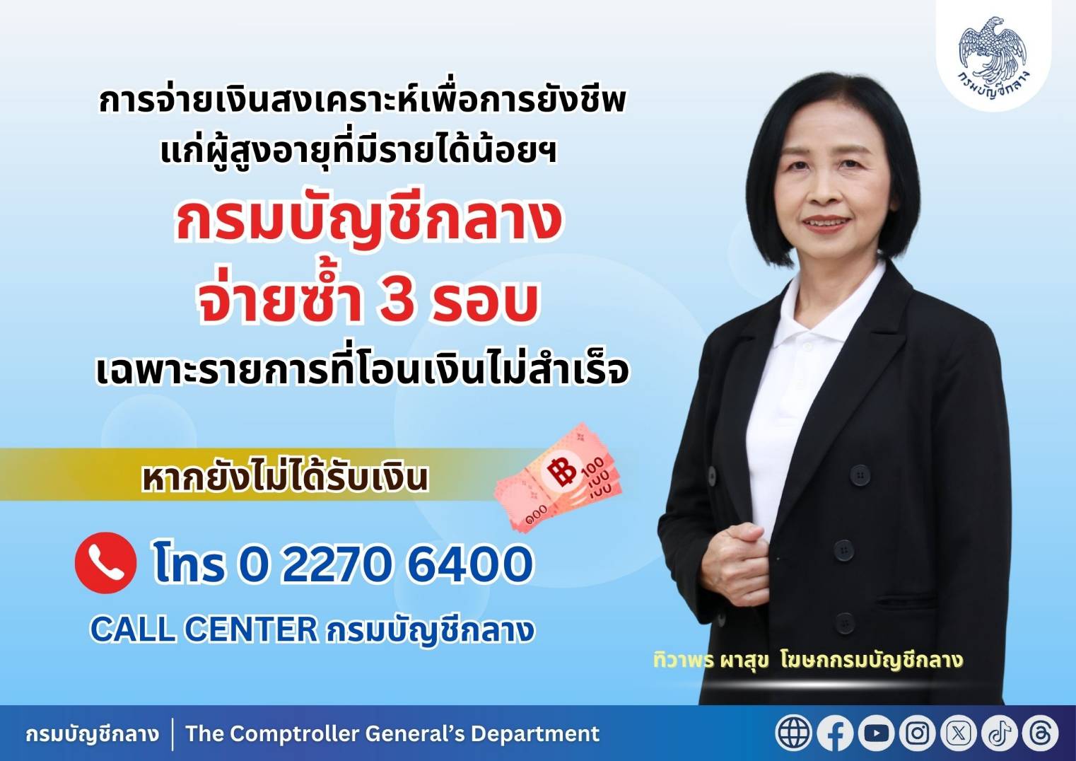“การแก้ไขรายการที่โอนเงินไม่สำเร็จ (Reject) ครั้งที่ 3 กรณีที่ไม่มีบัญชีพร้อมเพย์ที่ผูกกับเลขประจำตัวประชาชน และไม่มีบัญชีเงินฝากธนาคารตามหนังสือให้ความยินยอมฯ จะเพิ่มช่องทางการโอนเงินเข้าบัญชีเงินฝากธนาคารบัญชีเดียวกับที่ใช้รับเบี้ยยังชีพผู้สูงอายุ ทั้งนี้ หากมีข้อสงสัยสอบถามข้อมูลเพิ่มเติมได้ที่ Call Center กรมบัญชีกลาง หมายเลข 0 2270 6400 ในวัน เวลาราชการ” โฆษกกรมบัญชีกลาง กล่าว