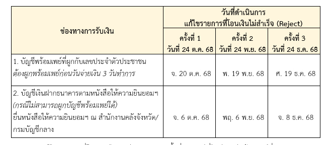 จากการโอนเงินทั้ง 3 วัน พบว่า มีรายการโอนเงินสำเร็จ จำนวน 5,358,599 คน คิดเป็นร้อยละ 99.19 และรายการที่โอนเงินไม่สำเร็จ (Reject) จำนวน 43,703 คน คิดเป็นร้อยละ 0.81 โดยรายการที่โอนเงินไม่สำเร็จส่วนใหญ่เกิดจากผู้สูงอายุไม่มีบัญชีพร้อมเพย์ที่ผูกด้วยเลขประจำตัวประชาชน รองลงมาเกิดจาก บัญชีปิด และไม่มีบัญชี ซึ่งกรมบัญชีกลางจะทำการจ่ายเงินเฉพาะรายการที่โอนเงินไม่สำเร็จ (Reject) จำนวน 3 ครั้ง ทุกวันที่ 24 ของเดือนตุลาคม เดือนพฤศจิกายน และเดือนธันวาคม 2568 โดยผู้สูงอายุที่ยังไม่ได้รับเงินจะต้องทำการผูกบัญชีพร้อมเพย์กับเลขประจำตัวประชาชน หรือแจ้งความประสงค์ให้โอนเงินเข้าบัญชีร่วมกับบุคคลอื่นหรือเข้าบัญชีบุคคลอื่น โดยดาวน์โหลดแบบฟอร์มหนังสือให้ความยินยอมโอนเงินสวัสดิการเข้าบัญชีร่วมกับบุคคลอื่นหรือเข้าบัญชีบุคคลอื่น ได้ทางเว็บไซต์โครงการลงทะเบียนเพื่อสวัสดิการแห่งรัฐ ปี 2565 (https://บัตรสวัสดิการแห่งรัฐ.mof.go.th หรือ https://welfare.mof.go.th) หรือขอรับและยื่นแบบฟอร์มได้ที่สำนักงานคลังจังหวัด หรือกรมบัญชีกลาง ภายในระยะเวลาที่กำหนด ดังนี้