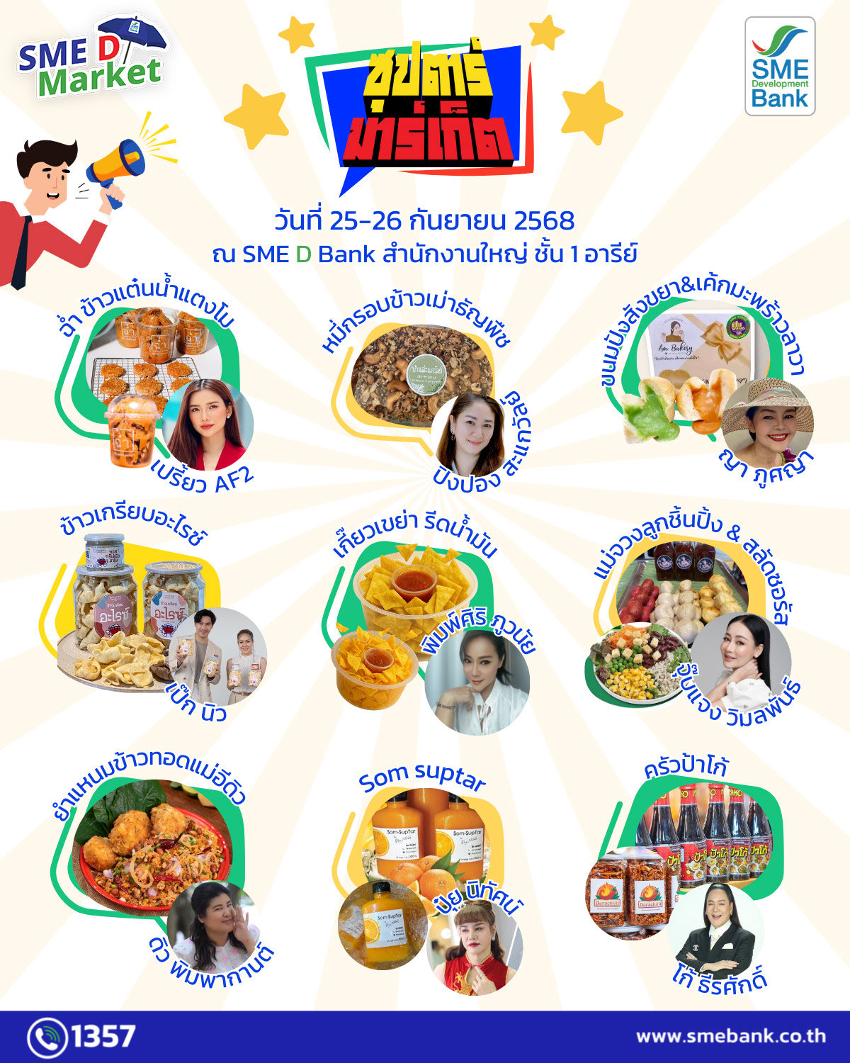 ธนาคารพัฒนาวิสาหกิจขนาดกลางและขนาดย่อมแห่งประเทศไทย (ธพว.) หรือ SME D Bank จัดกิจกรรมช่วยผู้ประกอบการเอสเอ็มอีเพิ่มรายได้ ขยายตลาด ปลุกกำลังซื้อ ขับเคลื่อนเศรษฐกิจไทยให้คึกคัก ในงาน"SME D Market" จัดระหว่างวันที่ 25-26 กันยายน 2568 ณ หน้าอาคาร และบริเวณชั้น 1 อาคาร SME Bank Tower สำหรับเดือนนี้ จัดภายใต้ธีม "ซุปตาร์มาร์เก็ต แท็กทีมหนุนเอสเอ็มอีไทย" ยกขบวนคนดัง ทั้งดารา นักแสดง มาร่วมออกบูธจำหน่ายสินค้า เพื่อสร้างแรงบันดาลใจในการทำธุรกิจ เปิดมุมมองการเป็นผู้ประกอบการ รวมถึง สร้างสีสันกระตุ้นส่งเสริมการตลาดให้ผู้ประกอบการเอสเอ็มอี เช่น “ภารดี ผลไม้แซ่บ สะท้านทรัพย์” คุณเปิ้ล ภารดี วงษ์สวัสดิ์, “หมี่คลุก Nina by Monster” โดยคุณฮาน่า ทัศนาวลัย , “เกี๊ยวซ่าต้าร์เตอร์พรีเมี่ยม” คุณกีตาร์ ศิริพิชญ์ วิมลโนช , “ฉ่ำ ข้าวแต๋นน้ำแตงโม” คุณอนุสรา วันทองทักษ์ (เปรี้ยว AF) "ข้าวหน้าไส้อั่ว หมูฝอย" คุณเกด ธิญาดา พรรณบัว และ “ครัวป้าโก้” คุณโก้ - ธีรศักดิ์ พันธุจริยา เป็นต้น