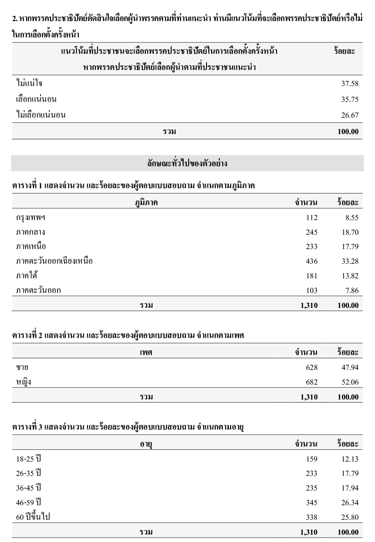 ท้ายที่สุดเมื่อถามถึงแนวโน้มที่ประชาชนจะเลือกพรรคประชาธิปัตย์ในการเลือกตั้งครั้งหน้า หากพรรคประชาธิปัตย์เลือกผู้นำตามที่ประชาชนแนะนำ พบว่า ตัวอย่าง ร้อยละ 37.58 ระบุว่า ไม่แน่ใจ รองลงมา ร้อยละ 35.75 ระบุว่า เลือกแน่นอน และร้อยละ 26.67 ระบุว่า ไม่เลือกแน่นอน
