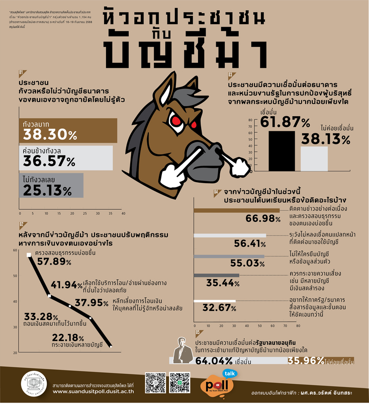 “สวนดุสิตโพล” มหาวิทยาลัยสวนดุสิต สำรวจความคิดเห็นประชาชนทั่วประเทศ เรื่อง “หัวอกประชาชนกับบัญชีม้า” กลุ่มตัวอย่าง จำนวน 1,154 คน (สำรวจทางออนไลน์และภาคสนาม) ระหว่างวันที่ 16-19 กันยายน 2568 พบว่า จากข่าวบัญชีม้าในช่วงที่ผ่านมา กลุ่มตัวอย่างรู้สึกกังวลมาก ร้อยละ 38.30 ว่าบัญชีตัวเองอาจถูกอายัดโดยไม่รู้ตัว โดยปรับพฤติกรรมตนเองด้วยการตรวจสอบธุรกรรมบ่อยขึ้น ร้อยละ 57.89 ทั้งนี้เชื่อมั่นต่อธนาคารและหน่วยงานรัฐในการปกป้องผู้บริสุทธิ์จากผลกระทบบัญชีม้า ร้อยละ 61.87 โดยบทเรียนหรือข้อคิดจากข่าวบัญชีม้า คือ ทำให้ติดตามข่าวอย่างต่อเนื่องและตรวจสอบธุรกรรมของตนเองบ่อยขึ้น ร้อยละ 66.98 รองลงมาคือ ระวังไม่ให้หลงเชื่อคนแปลกหน้าที่ติดต่อมาขอใช้บัญชี ร้อยละ 56.41 ในภาพรวมรู้สึกเชื่อมั่นต่อรัฐบาลนายอนุทิน ในการจะเข้ามาแก้ปัญหาบัญชีม้า ร้อยละ 64.04