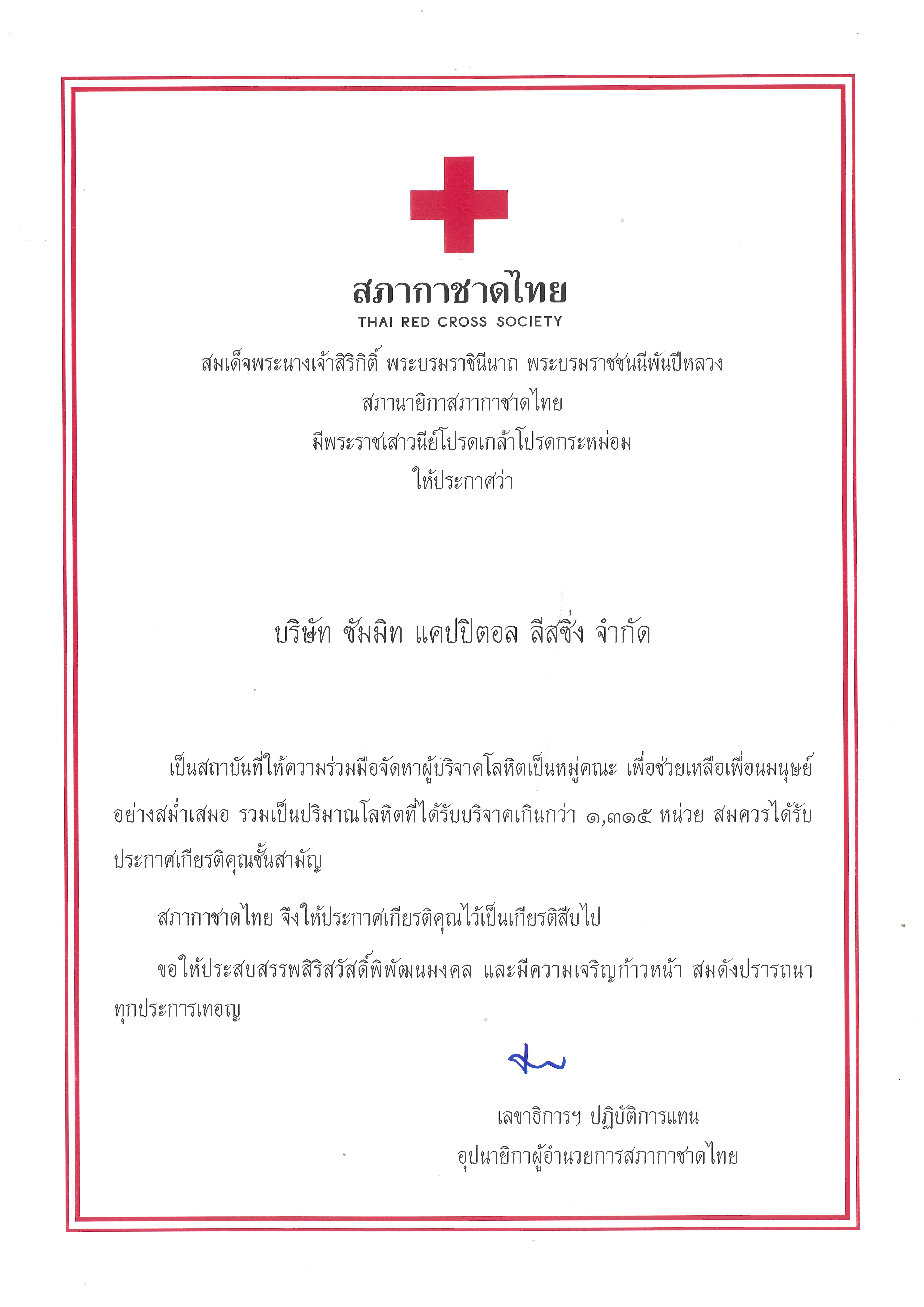 คุณโยซูเกะ อูนิกาเมะ กล่าวว่า “ที่ผ่านมา ซัมมิท แคปปิตอล ให้ความสำคัญของการช่วยเหลือชีวิตเพื่อนมนุษย์ที่จำเป็นต้องการใช้โลหิต และส่งต่อโลหิตเพื่อนำไปใช้ช่วยชีวิตผู้ป่วยทั่วประเทศที่ต้องการเลือด โดยร่วมกับ ศูนย์บริการโลหิตแห่งชาติ สภากาชาดไทย จัดกิจกรรมบริจาคโลหิตตั้งแต่ปี พ.ศ. 2565 โดยเปิดหน่วยรับบริจาคประจำทุกๆ 3 เดือนมาอย่างต่อเนื่อง ซึ่งผู้ร่วมบริจาคโลหิตประกอบด้วย ผู้บริหาร พนักงาน ตลอดจนพนักงานภายในอาคารอื้อจือเหลียง และประชาชนในพื้นที่ใกล้เคียง เพื่อเป็นอีกหนึ่งช่องทางในการช่วยเพิ่มคลังเลือดให้เพียงพอต่อความต้องการ ดังนั้นรางวัลนี้ไม่ใช่เพียงการยกย่ององค์กร แต่คือเครื่องยืนยันถึงความมุ่งมั่นร่วมกันของผู้บริหารและพนักงานทุกคน ที่พร้อมสานต่อเจตนารมณ์ของซัมมิท แคปปิตอล ในการทำธุรกิจควบคู่กับการสร้างสังคมที่เข้มแข็งและยั่งยืน”
