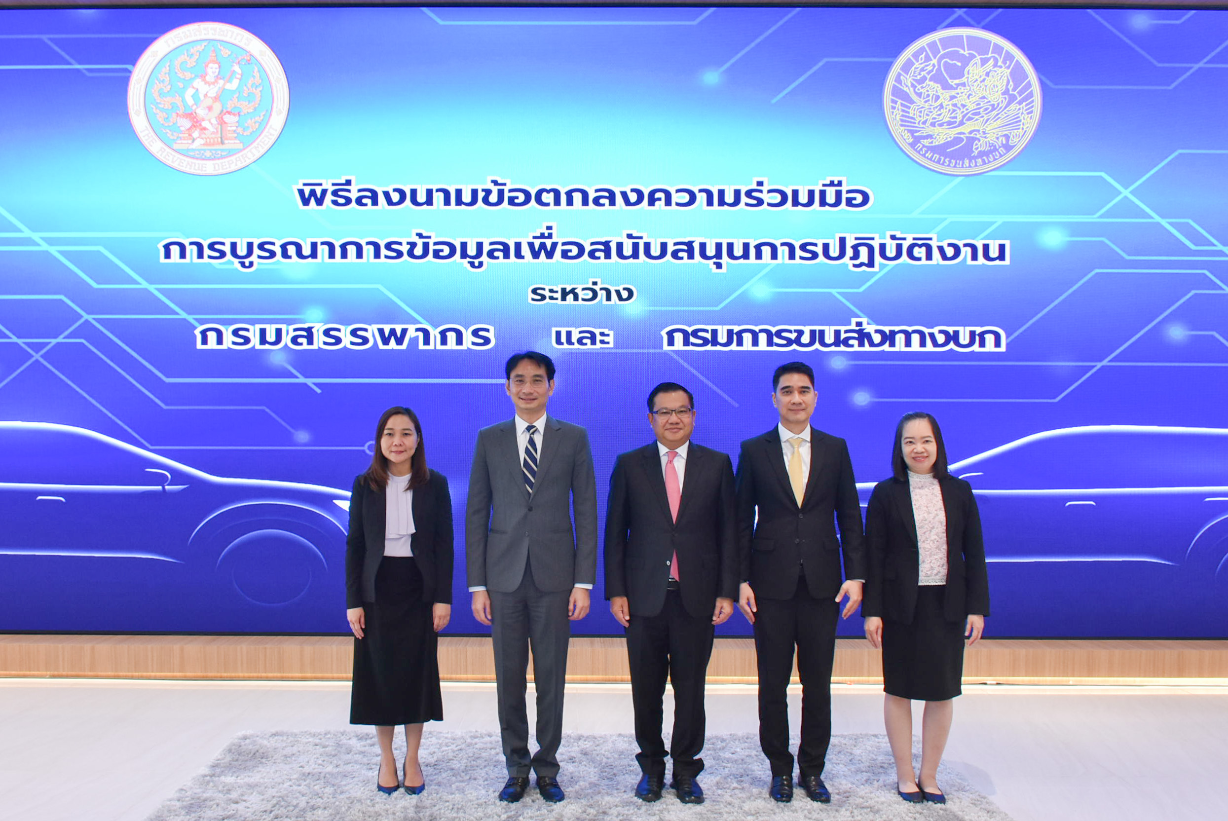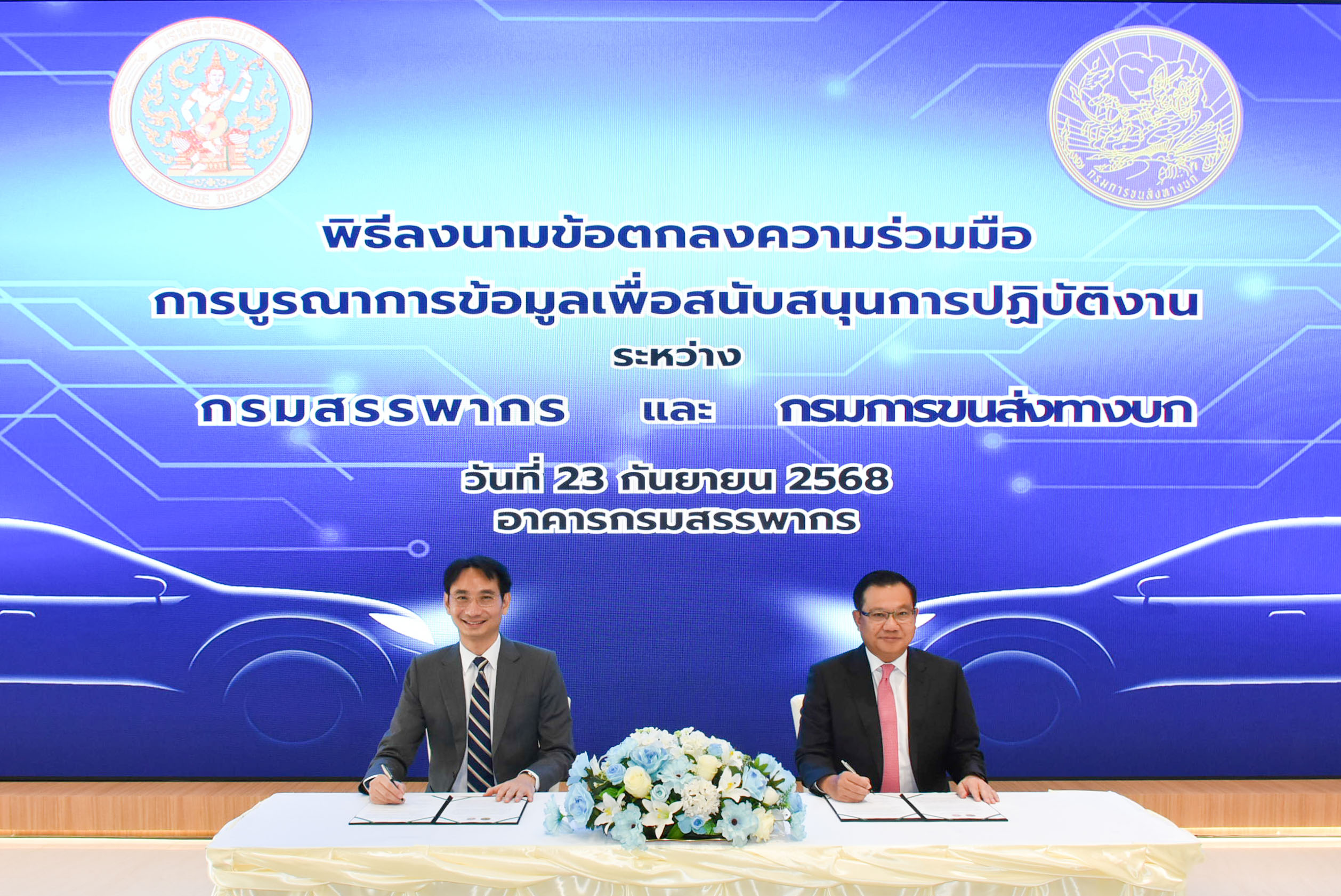 นายปิ่นสาย สุรัสวดี อธิบดีกรมสรรพากร และนายจิรุตม์ วิศาลจิตร อธิบดีกรมการขนส่งทางบก ได้ร่วมลงนามในบันทึกข้อตกลงความร่วมมือ (MOU) ณ กรมสรรพากร เพื่อบูรณาการข้อมูลระหว่างสองหน่วยงาน โดยมีเป้าหมายเพื่อเพิ่มประสิทธิภาพการจัดเก็บภาษีอากรให้ครอบคลุมและเป็นธรรม ควบคู่กับการยกระดับการให้บริการประชาชนของทั้งสองหน่วยงาน ให้เกิดประสิทธิภาพสูงสุด