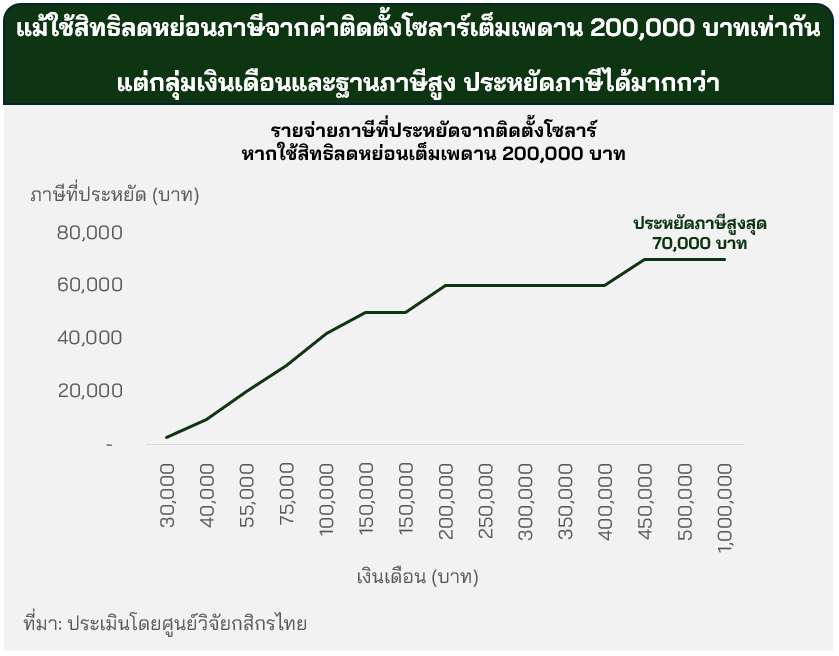 ศูนย์วิจัยกสิกรไทยมองว่า กลุ่มที่ได้ประโยชน์สูงสุดจากการลดหย่อนภาษีติดตั้งโซลาร์ คือผู้มีรายได้ 120,000 - 180,000 บาทต่อเดือน ประหยัดภาษีได้มากสุดราว 50,000 บาทต่อปี ขณะที่กลุ่มรายได้ต่ำกว่า 30,000 บาทต่อเดือนจะไม่ได้สิทธิเพราะไม่เสียภาษี ส่วนผู้มีรายได้สูงกว่าช่วงดังกล่าว มักต้องใช้โซลาร์ขนาดเกิน 10 kW ซึ่งไม่ครอบคลุมในมาตรการนี้