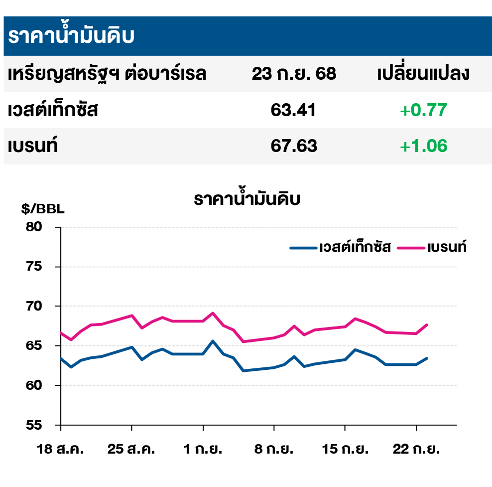 (+) ราคาน้ำมันดิบปรับเพิ่มขึ้น หลังสถานการณ์ความขัดแย้งในภูมิภาคยุโรปตะวันออกยังต้องจับตาอย่างใกล้ชิด หลังผู้นำโปแลนด์แสดงท่าทีแข็งกร้าวที่จะมีมาตรการตอบโต้ที่ชัดเจนหากรัสเซียเข้ามารุกล้ำน่านฟ้า ท่าทีดังกล่าวสอดคล้องกับคำให้สัมภาษณ์ล่าสุดของนายโดนัลด์ ทรัมป์ ประธานาธิบดีสหรัฐฯ ซึ่งกล่าวว่าชาติในกลุ่มองค์การสนธิสัญญาแอตแลนติกเหนือหรือนาโต้ (NATO) สามารถที่จะตอบโต้ต่ออากาศยานของรัสเซียได้ทันที
