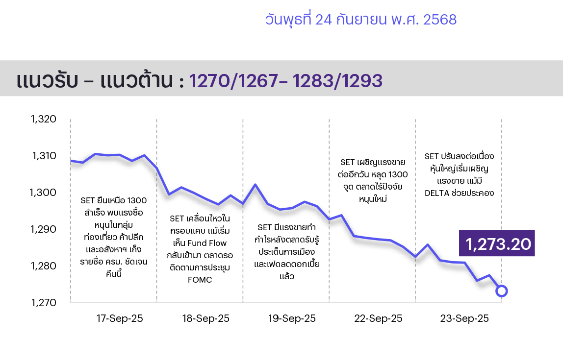 ช่วงสั้นมอง SET มีโอกาสพักฐานหรือแกว่งตัวในกรอบแคบ หลังขาดปัจจัยหนุนใหม่ ปัจจัยในประเทศยังอยู่ระหว่างรอติดตามแผนการออกมาตรการกระตุ้นเศรษฐกิจของรัฐบาลใหม่ ซึ่งจะมีผลต่อการเรียกความเชื่อมั่นการลงทุนให้ฟื้นตัวและการไหลเข้าของ Fund Flow ในระยะถัดไป ขณะที่ปัจจัยต่างประเทศติดตามตัวเลขเศรษฐกิจสำคัญของสหรัฐฯ อาทิ PMI และ PCE ซึ่งหากออกมาแย่กว่าตลาดคาด จะมีผลต่อการพิจารณาตัดสินใจเร่งลดดอกเบี้ยนโยบายของเฟดในระยะถัดไป อย่างไรก็ดีมอง SET เริ่มมี Upside จำกัดและอาจชะลอการขึ้นสั้นบ้าง หลังดัชนีปรับขึ้น 19% ในช่วง 3 เดือนที่ผ่านมา แต่ Downside ยังจำกัดเช่นกัน หลังเริ่มเห็น Fund Flow ชะลอการขาย ประเมิน SET มีแนวต้านบริเวณ 1320 และมีแนวรับ 1280 ดังนั้นกลยุทธ์ลงทุนจึงคงแนะนำให้ “Selective Buy”